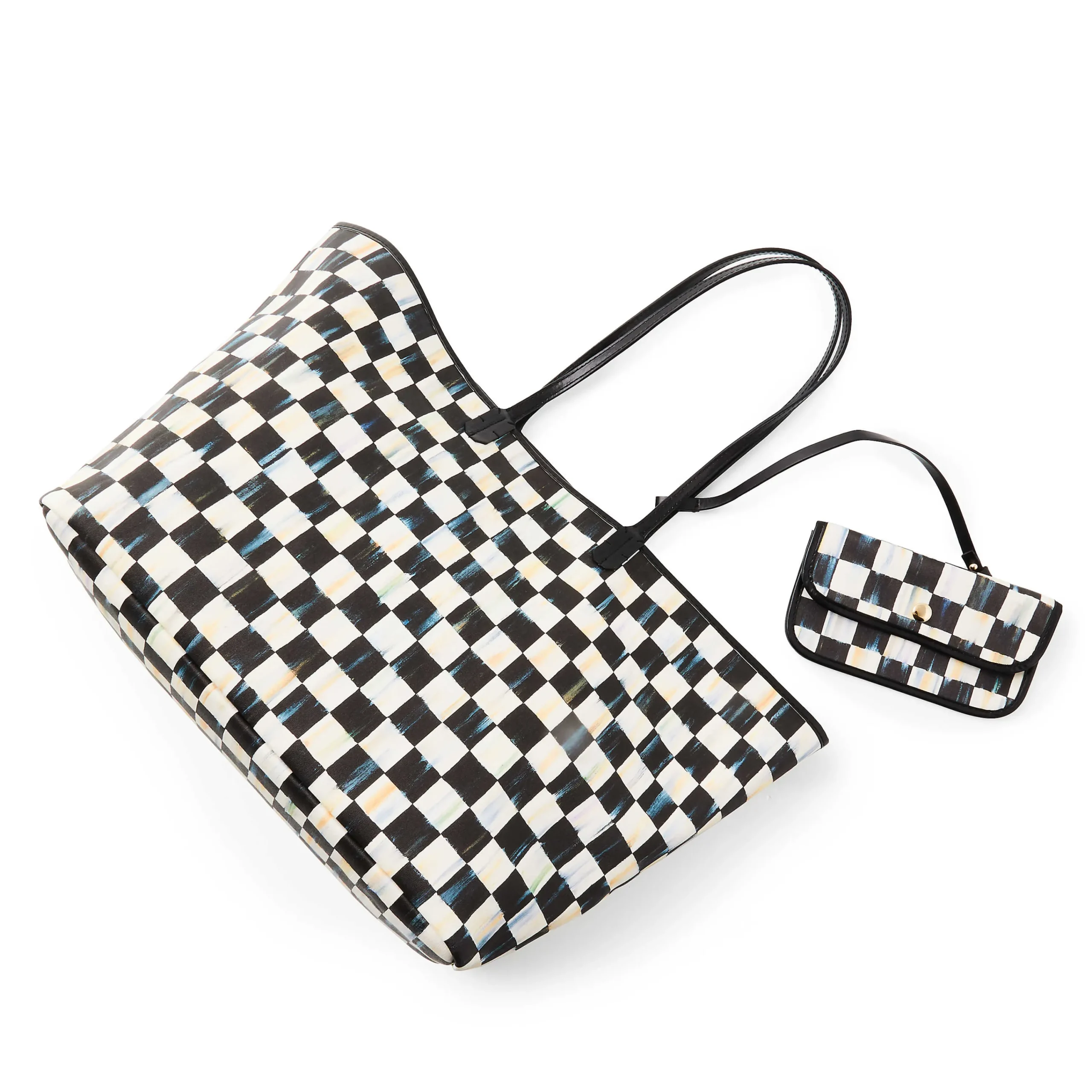 Take MacKenzie-Childs wherever you go with the Courtly Check® Marche Large Tote. This flat-bottom bag, made of a laminated canvas featuring our signature check, has leather straps and a detachable pouch that can hold credit cards, eyeglasses, or a cell phone.