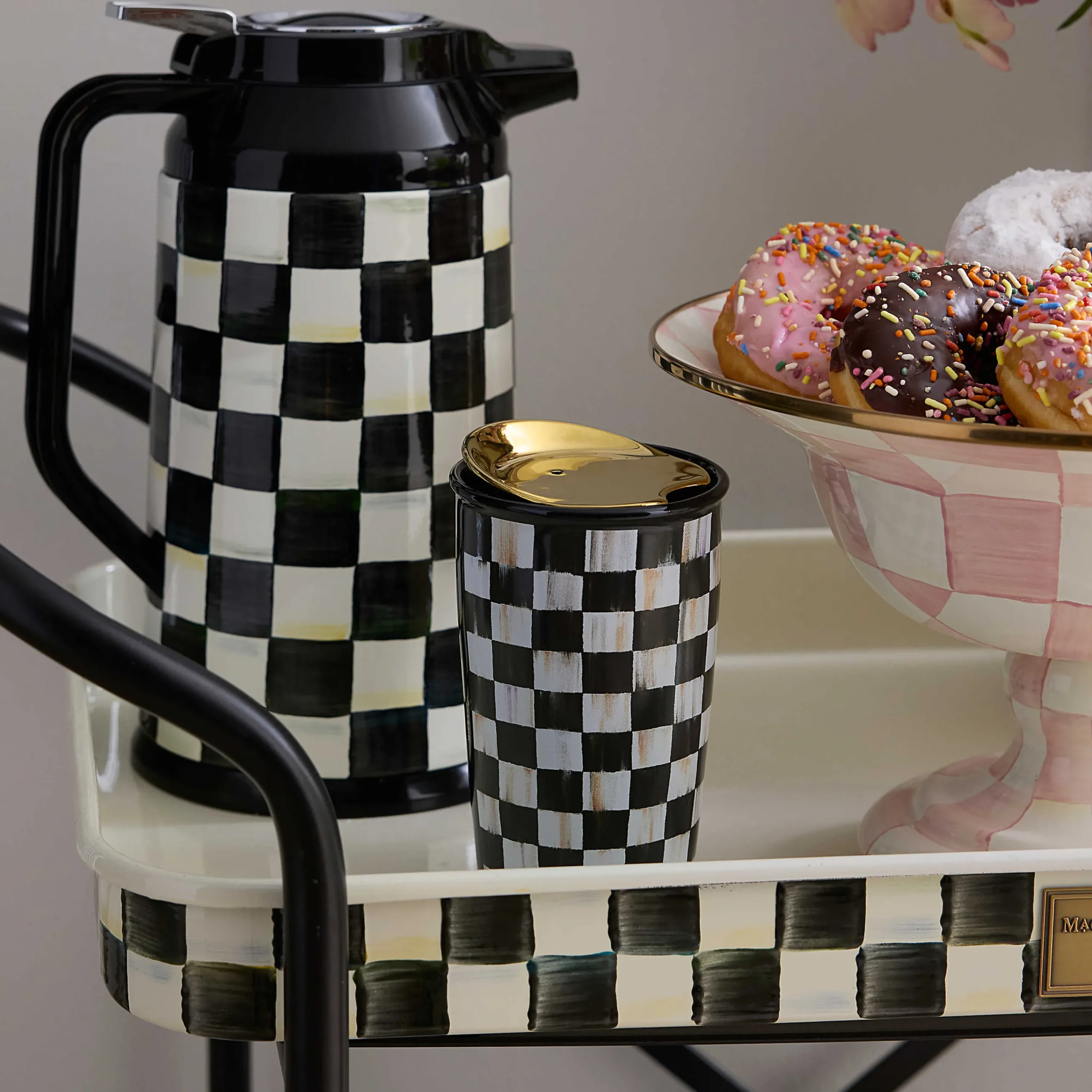 The daily commute might still be a grind, but with our Courtly Check® Ceramic Travel Cup, you can at least sip your morning brew in style. The porcelain body is decorated with a hand-applied Courtly Check, topped with an electroplated gold lid. It’s the perfect gift for the fan who wants her MacKenzie-Childs “to go.”