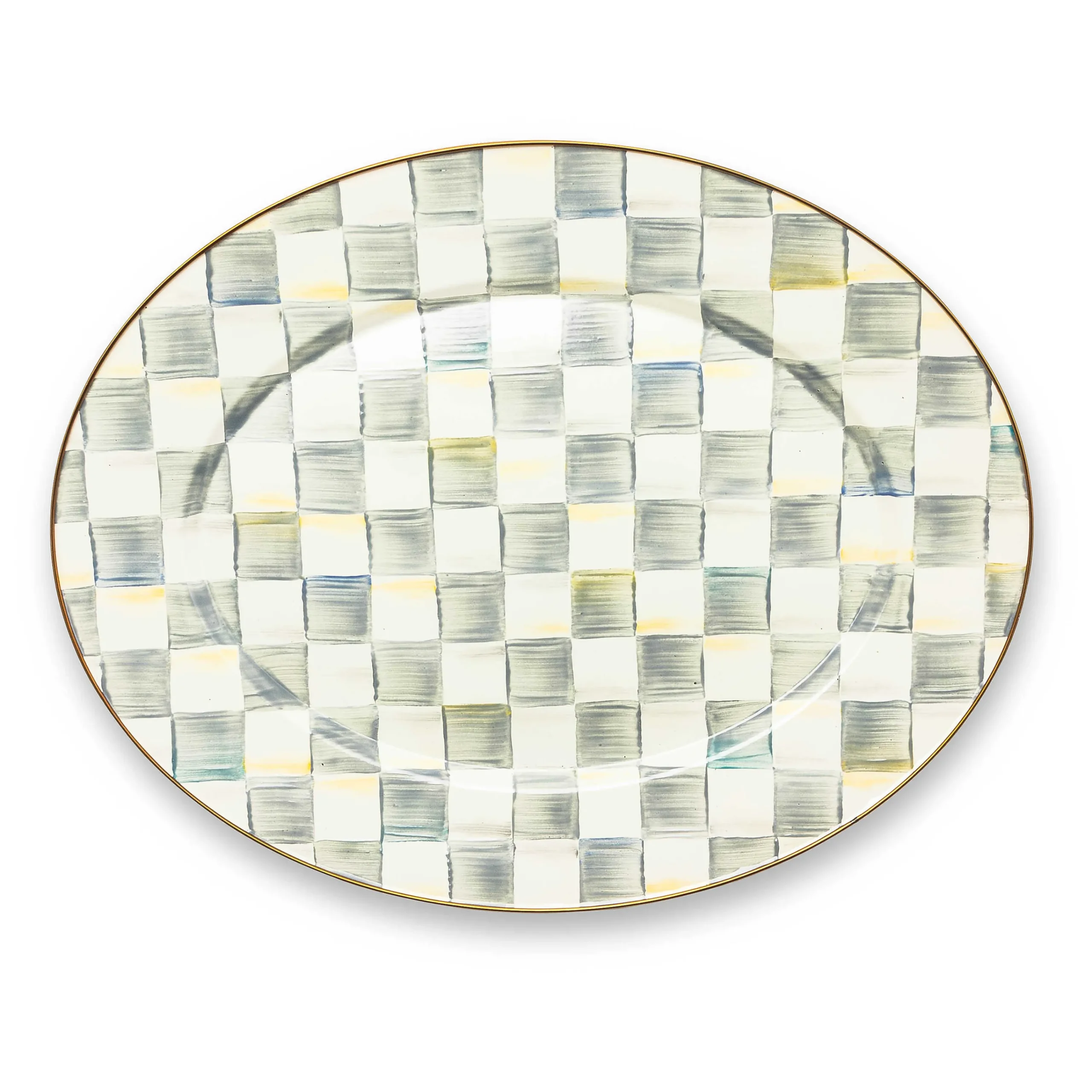 A great addition to the dinner or buffet table, the Large Sterling Check® Enamel Oval Platter features hand-painted checks on a steel underbody, trimmed with a bronzed stainless-steel rim.