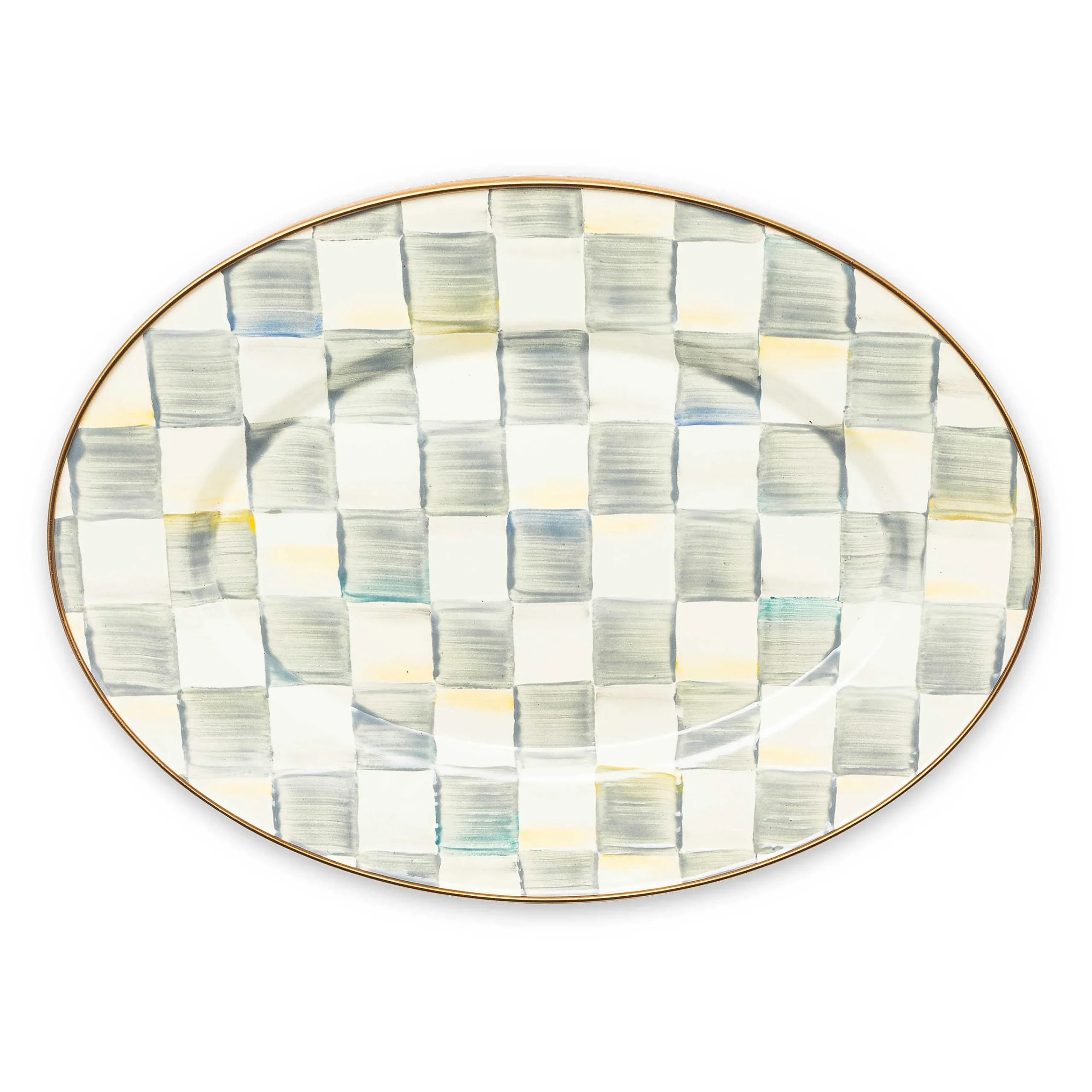 A great addition to the dinner or buffet table, the Small Sterling Check® Enamel Oval Platter features hand-painted checks on a steel underbody, trimmed with a bronzed stainless-steel rim.
