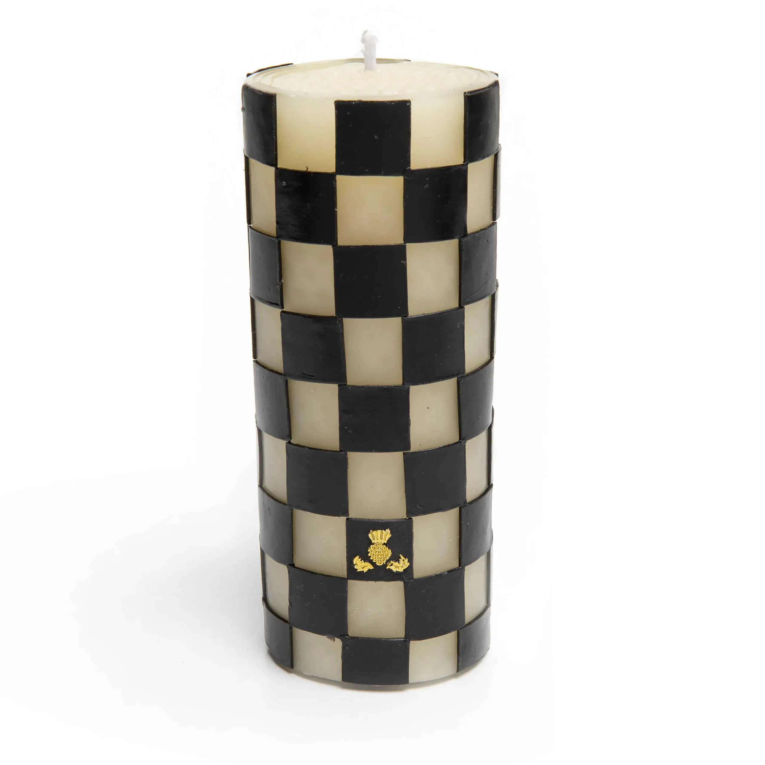 There are few things more comforting than the warm cast of a dancing flame. A blend of beeswax and paraffin, our 6″ Black Check Pillar Candle makes a thoughtful hostess gift, embellished with hand-appliqued checks and our golden thistle logo. Create a dramatic centerpiece in your home by grouping it with pillars and tapers of varying heights in cream and ebony.