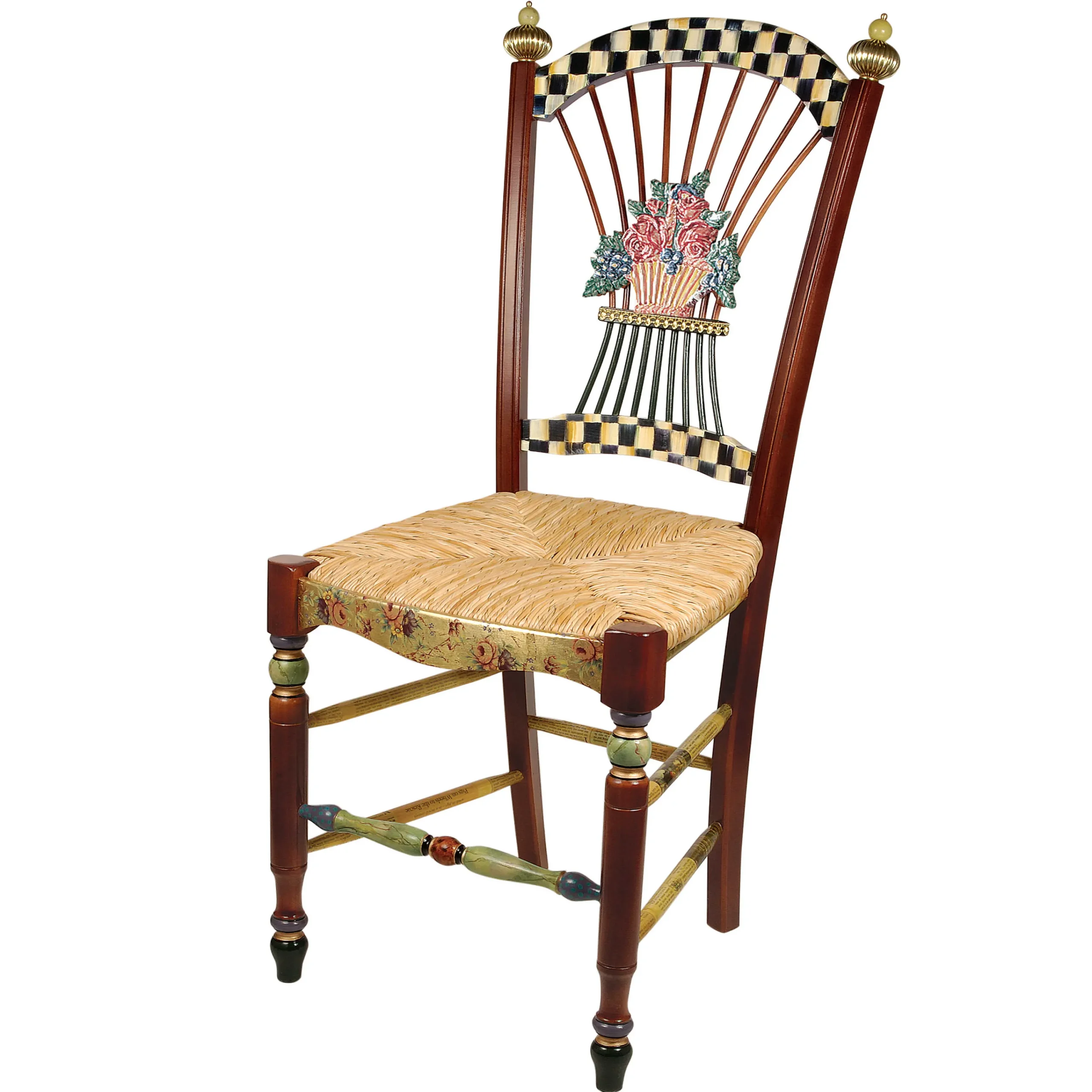 As dramatic as a black-tie corsage, the Dark Flower Basket Side Chair directs a theatrical arrangement of familiar favorites. Marked by our signature Courtly Checks®, a gold-leaf apron enhanced with ceramic floral transfers, and hand-painting (including faux marble), this maple-framed chair with a woven rush seat also boasts gold-dust banding, a handmade and decorated ceramic relief floral tile, and finials of natural stone and crimped brass. A scene-stealer set alone, it also performs exquisitely in an ensemble cast of Flower Basket Chairs, both light and dark.