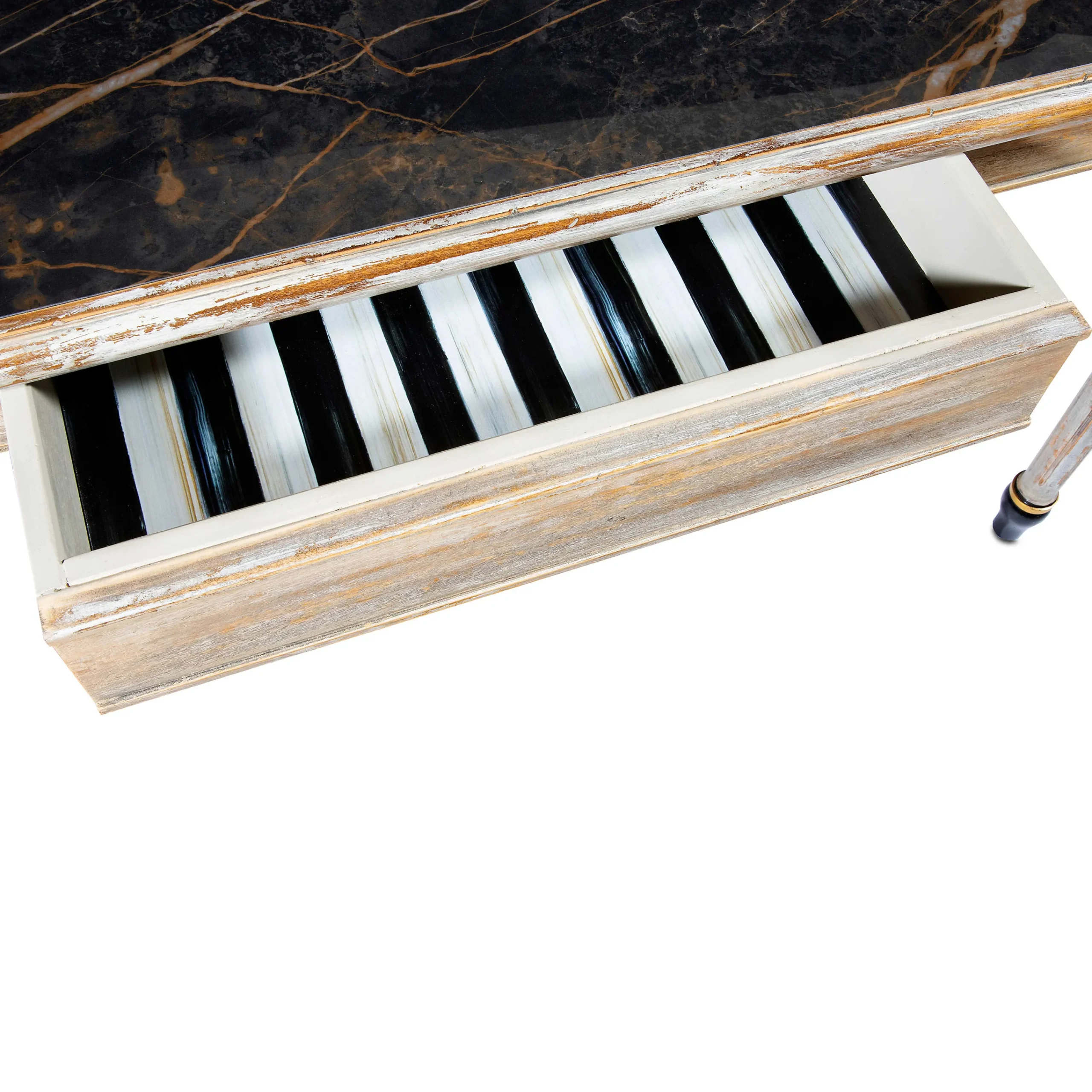 Our Tuscan Farm 54” Dining Table is the perfect place for family and friends to gather. Made of tulip wood and beechwood with a hand-applied, multilayer finish, its porcelain top, featuring classic marble veining, is stain- and heat-resistant. A bonus drawer lined with Courtly Stripe offers a spot for linens or silverware. Additional hand-painted Courtly Check® and Courtly Stripe are added to the apron and the legs by our Aurora, New York, artisans. This table seats up to six and can be paired with several of our existing dining chairs. It’s also perfect as a desk or work surface.