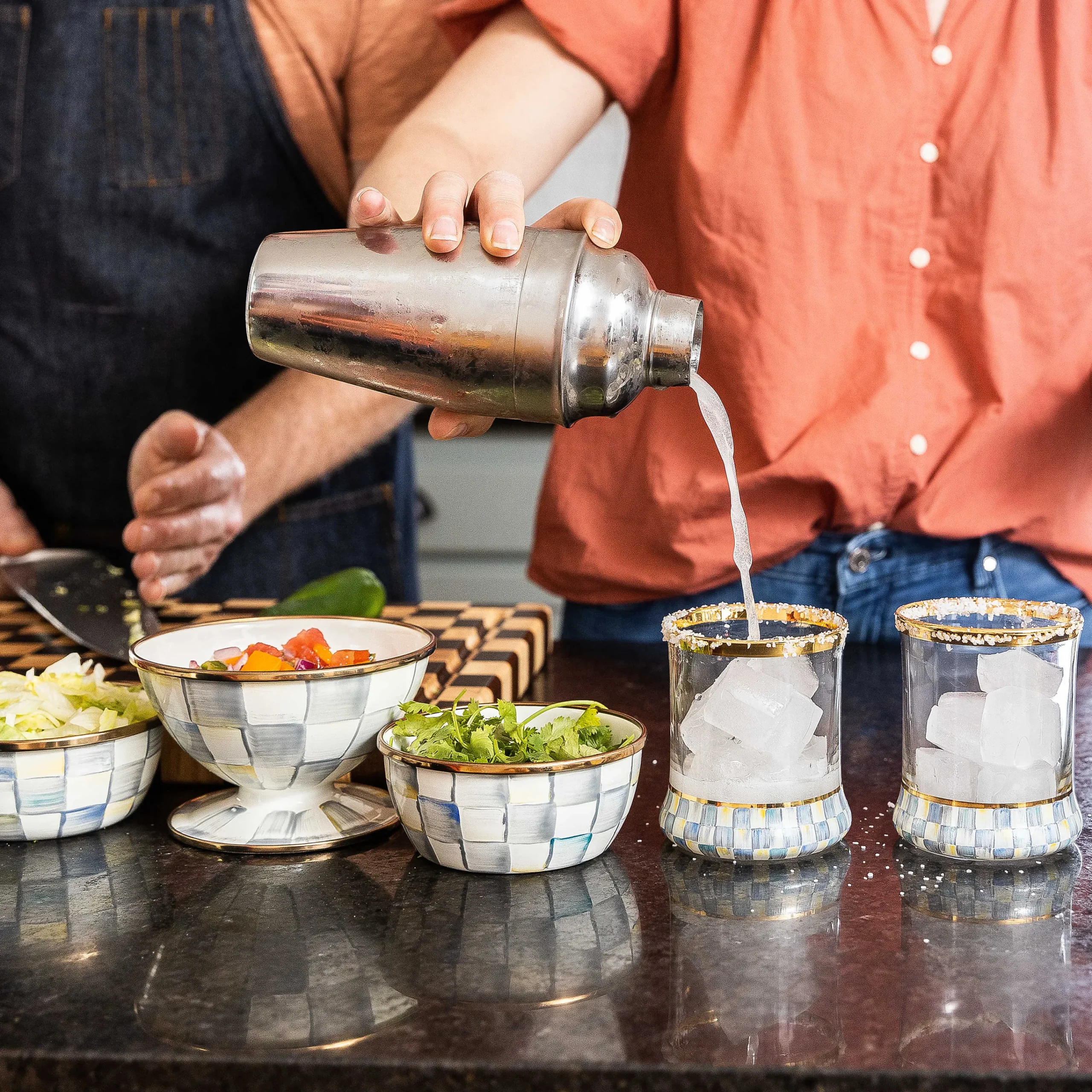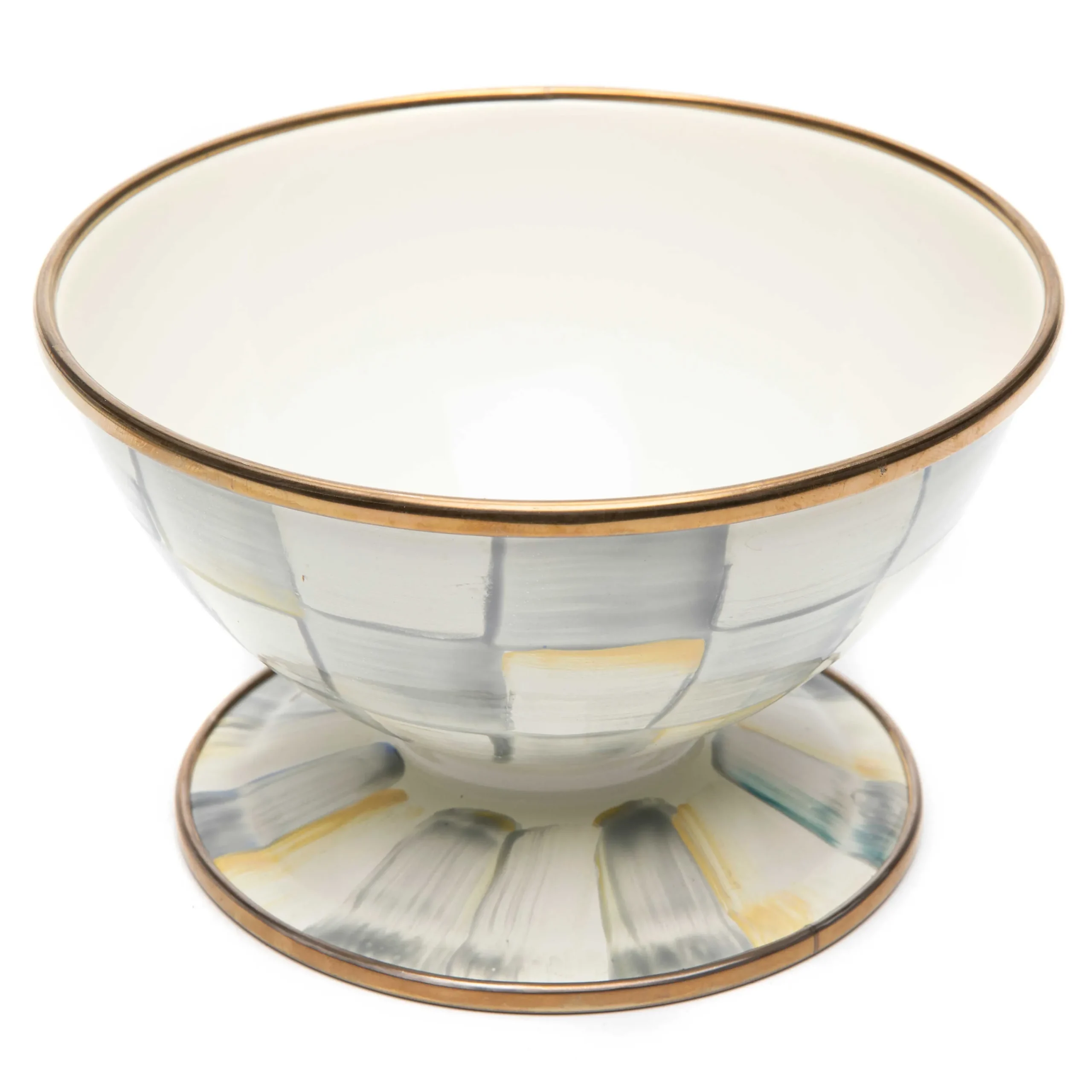 Scoop up signature style with our Sterling Check Enamel Ice Cream Dish. The deep bowl and pretty pedestal are decked in our hand-painted grey checks and rimmed in bronzed stainless steel. Spectacular in a set for a birthday party treat and equally splendid for satisfying a solo sundae craving