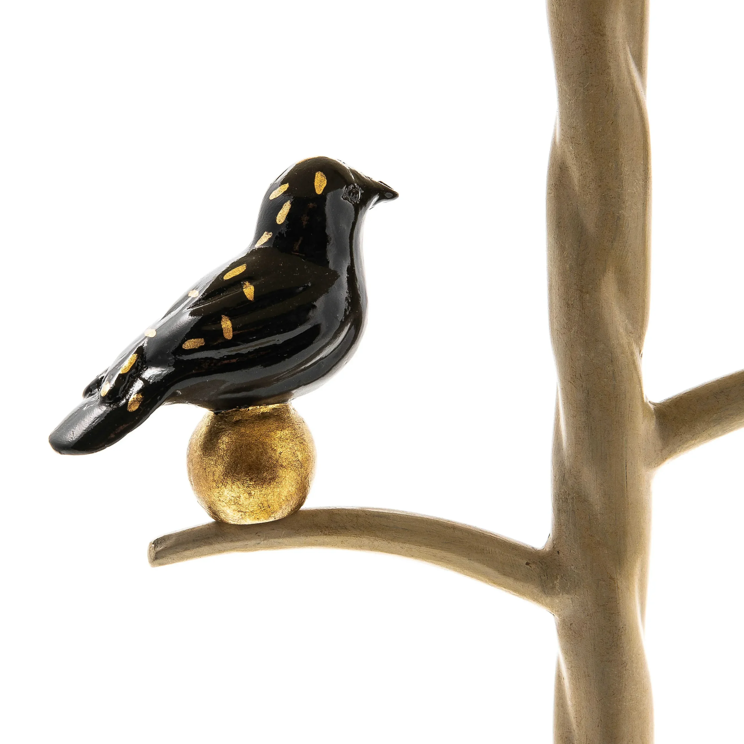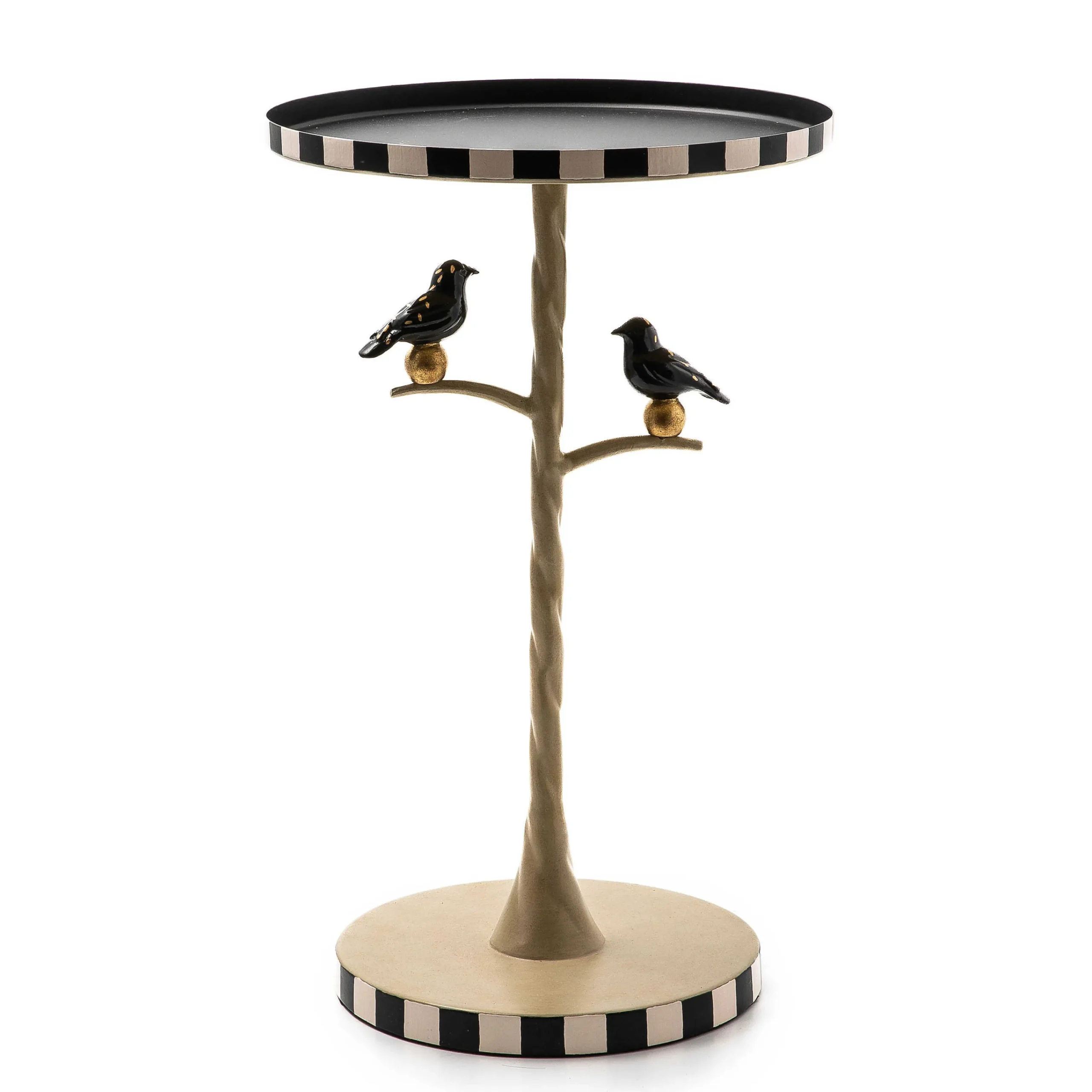 Small in stature but big on style, this hand-painted metal accent table features two goldleaf birds on a center column, which resembles a tree branch. The matte black top is trimmed with black and white stripes.