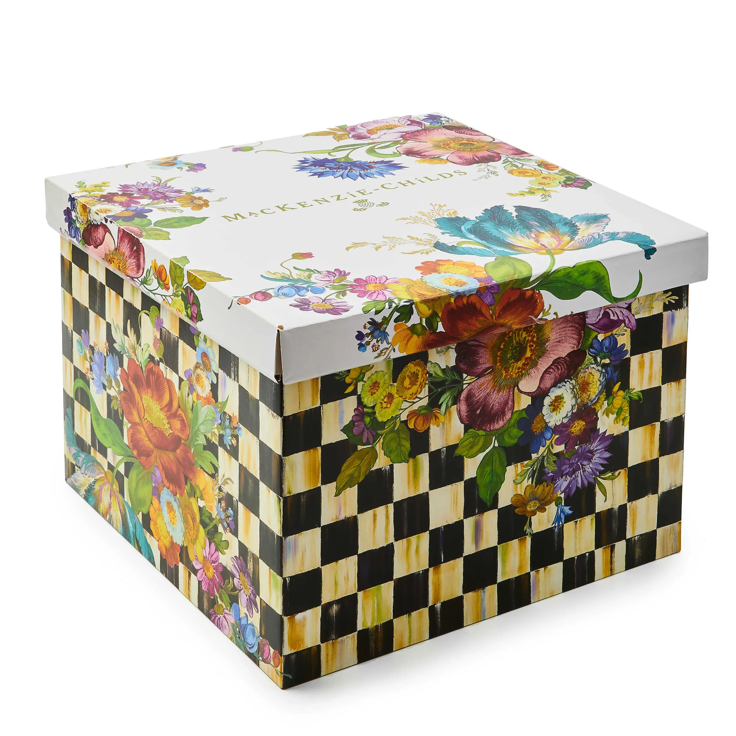 Our Gift Box Set is just as special as what’s inside of it and allows you to present a MacKenzie-Childs gift in our signature style. Kit includes one gift box (base amp; lid), white tissue paper, and ribbon, plus video instructions for box assembly via QR code.Here’s a handy guide to which types of products will fit inside this box:Two Tier Sweet StandAll Vases (enamel amp; ceramic)Set of Three Canisters (small, medium, and large)PillowsEverything BowlPaper Towel Holder