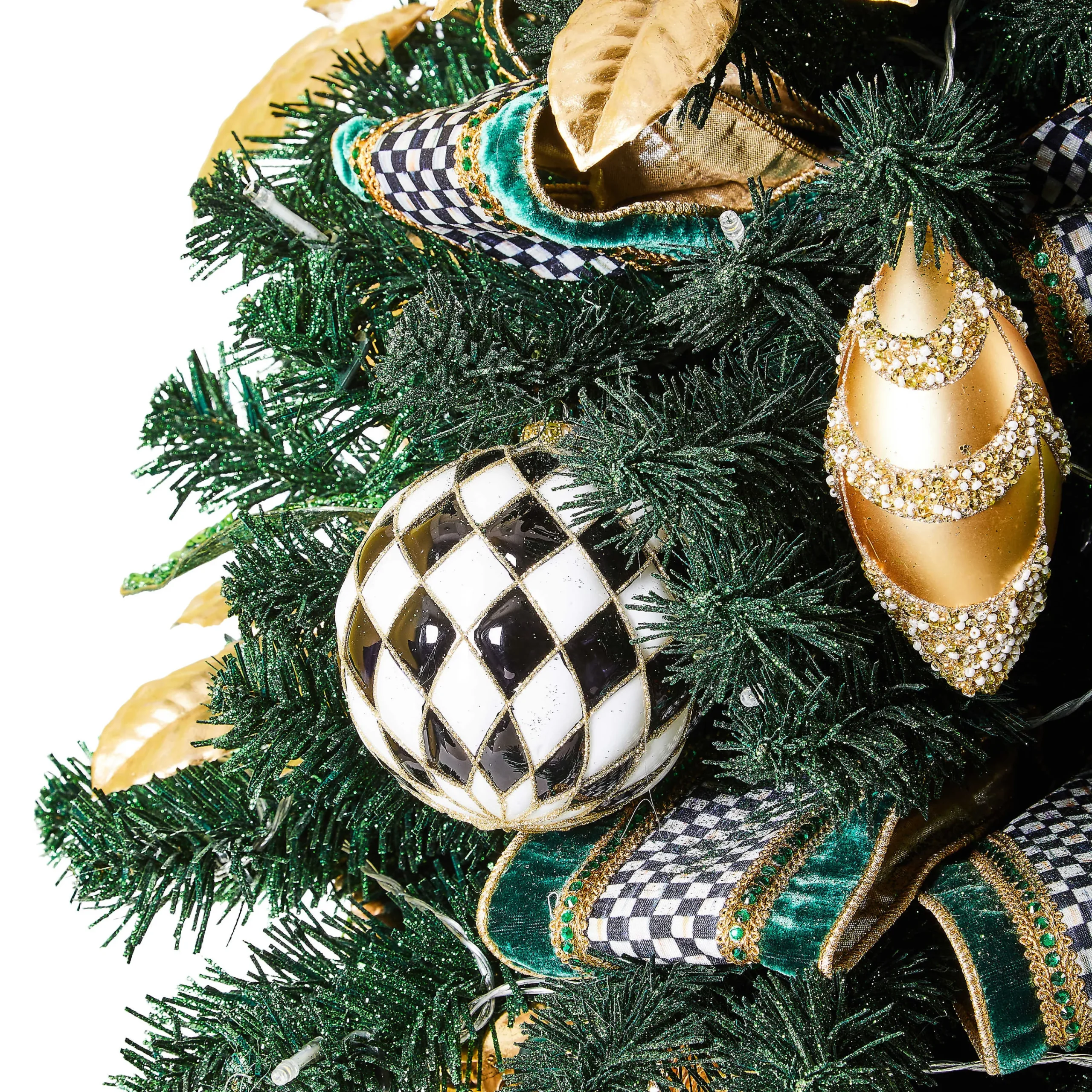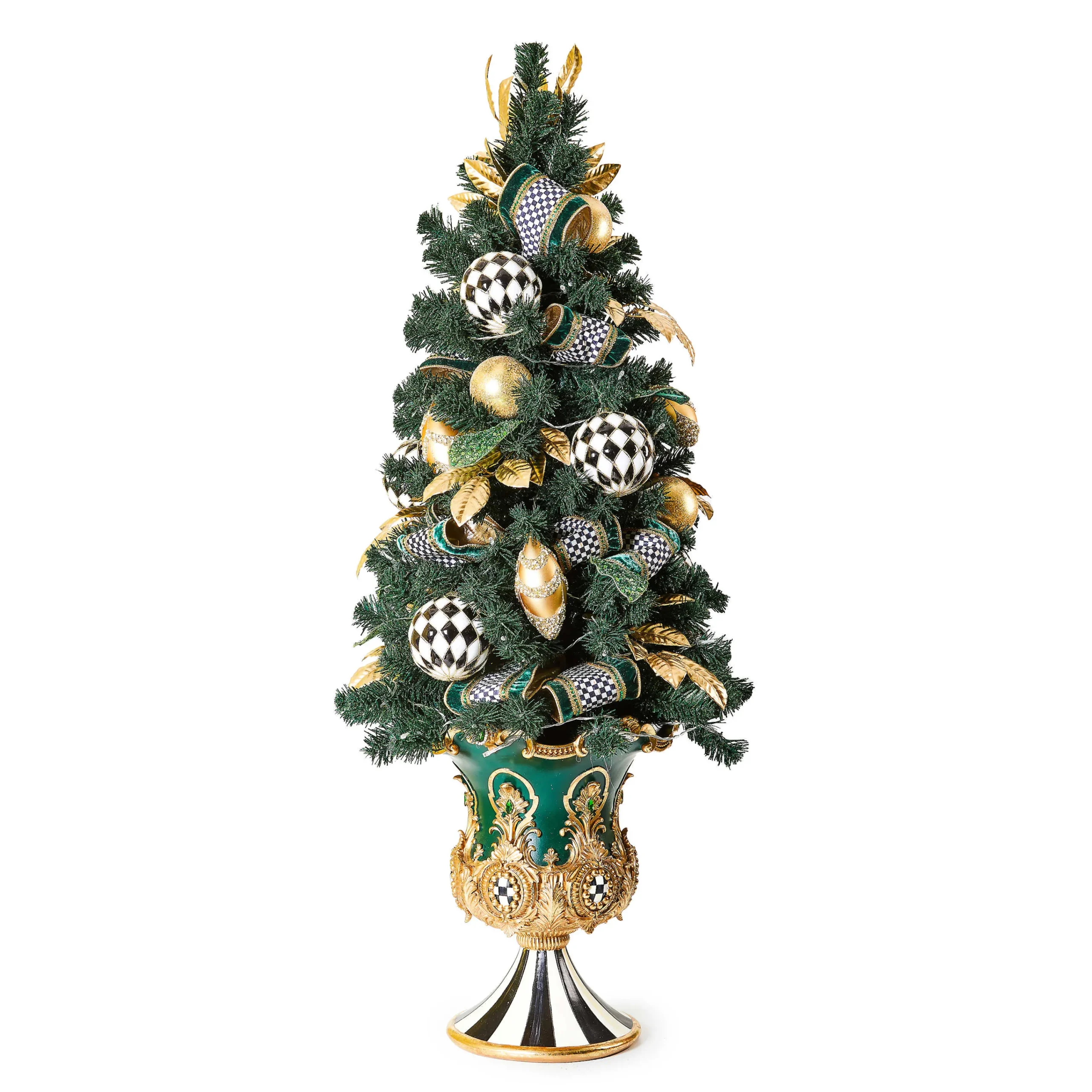 Deck the tabletops with this everlasting, illuminated potted tree, featuring glittered emerald green leaves and golden magnolia leaves. It’s embellished with shatterproof ornaments and trimmed with Courtly Check® and emerald green velvet ribbon. It’s set in an emerald green and gold pedestal urn that’s decorated with Courtly Stripe on the base.