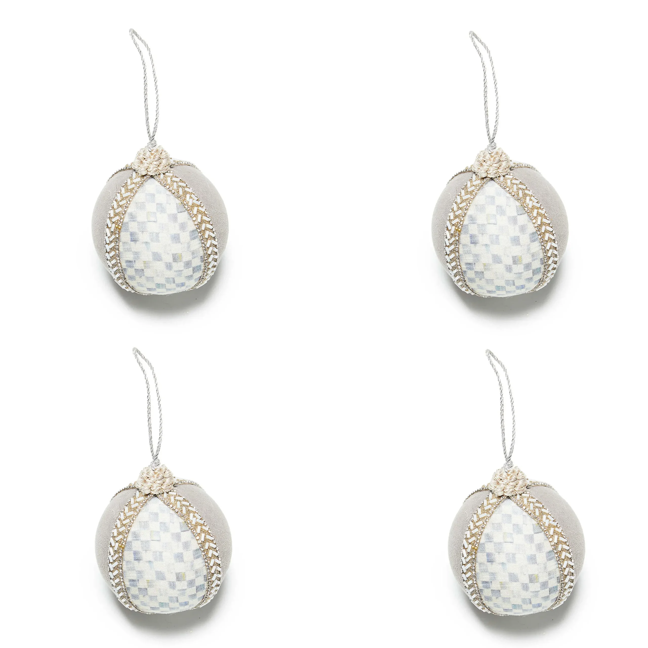 Make the tree a winter wonderland with this set of four ball ornaments, featuring panels of Sterling Check® and faux grey suede and finished with bugle bead trim.