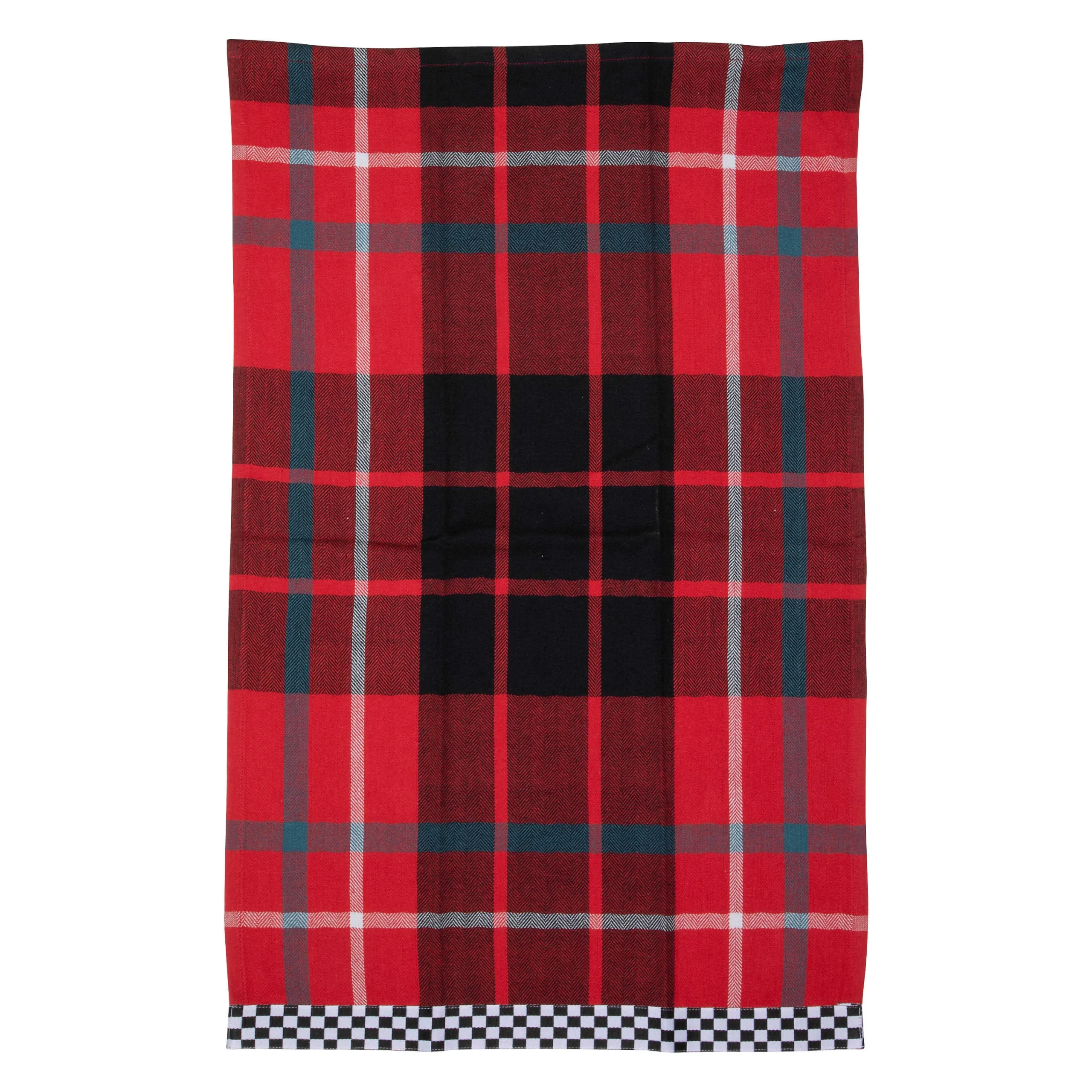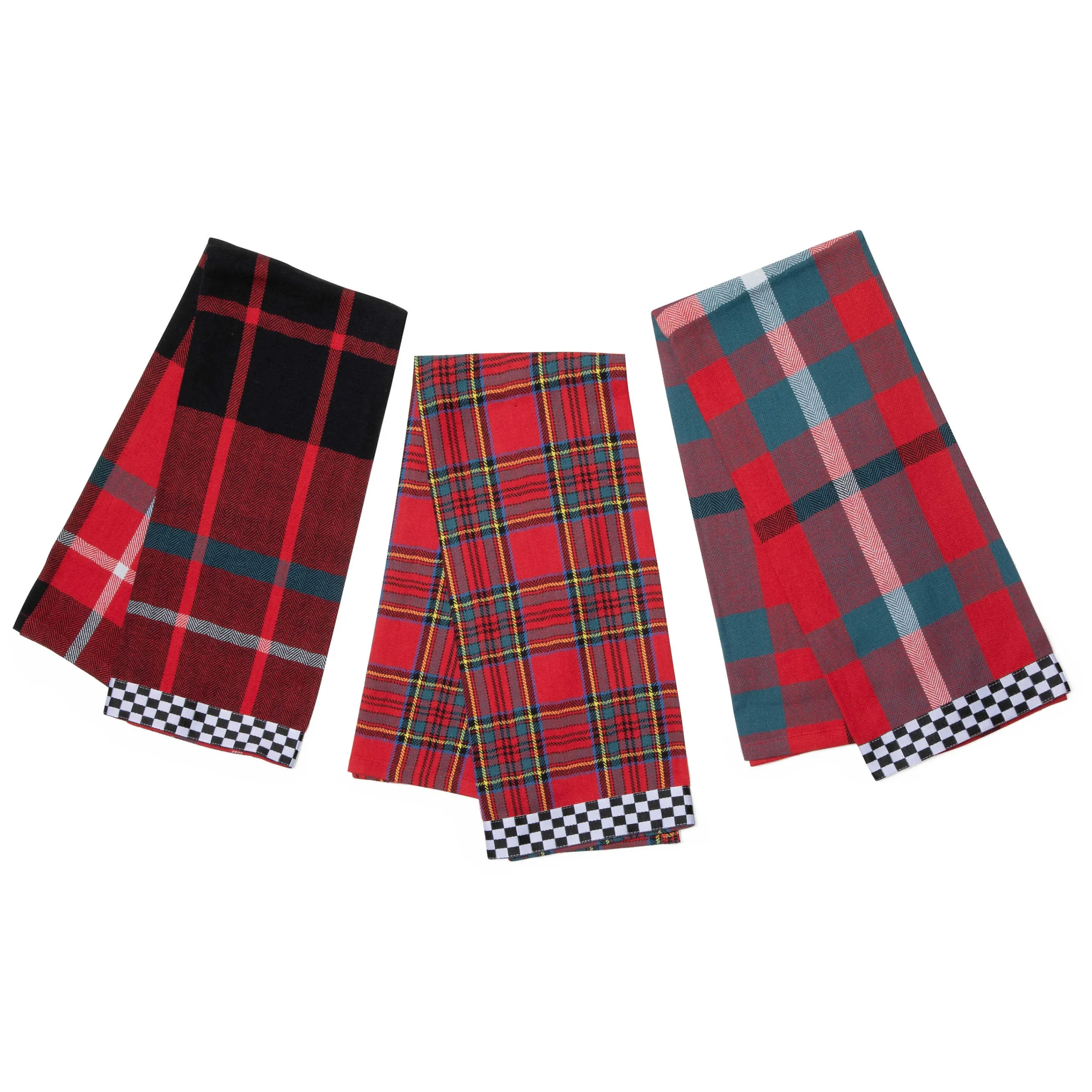 Pretty and practical, this set of three dish towels features unique tartan patterns of red and green, trimmed with black and white checks.