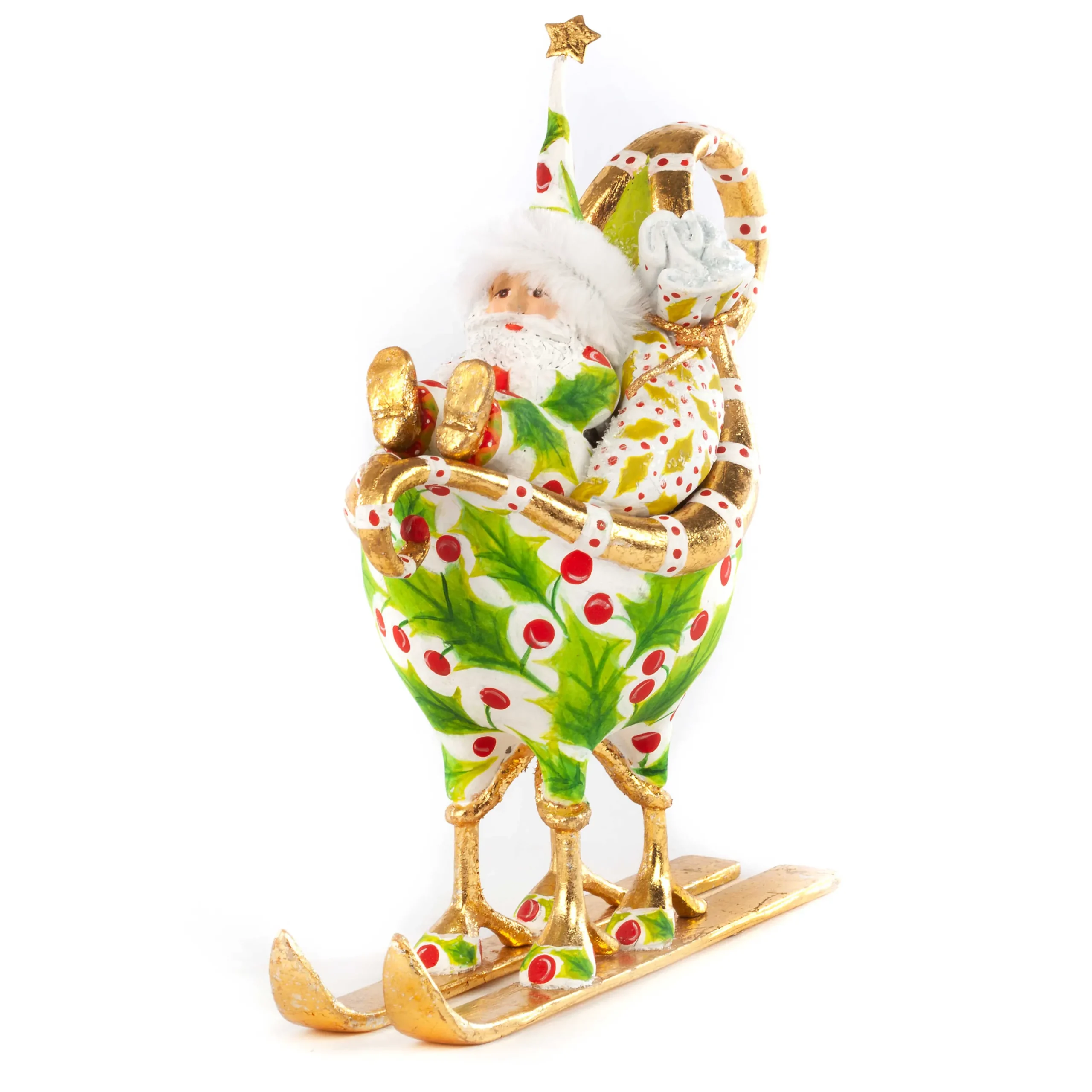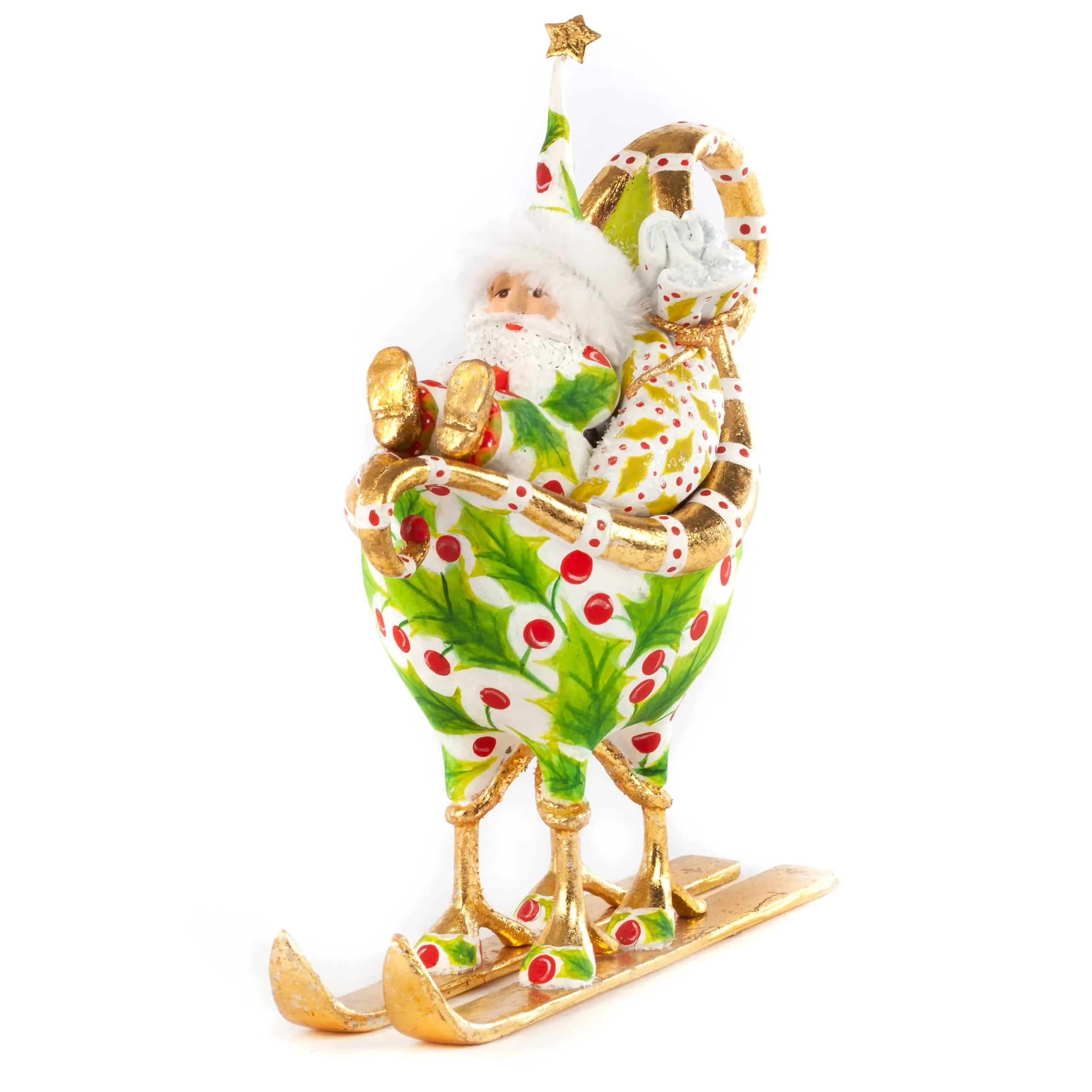 Dash Away, inspired by the Christmas classic “’Twas the Night Before Christmas,” features Santa’s eight reindeer ready to take flight around the world, assisted by their delightfully dedicated elves, Santa, and Mrs. Santa. The Patience Brewster Dash Away Santa in Sleigh Ornament features a jolly Santa seated in a sleigh decorated with holly and gold leaf that’s carried atop reindeer hooves mounted to golden skis.