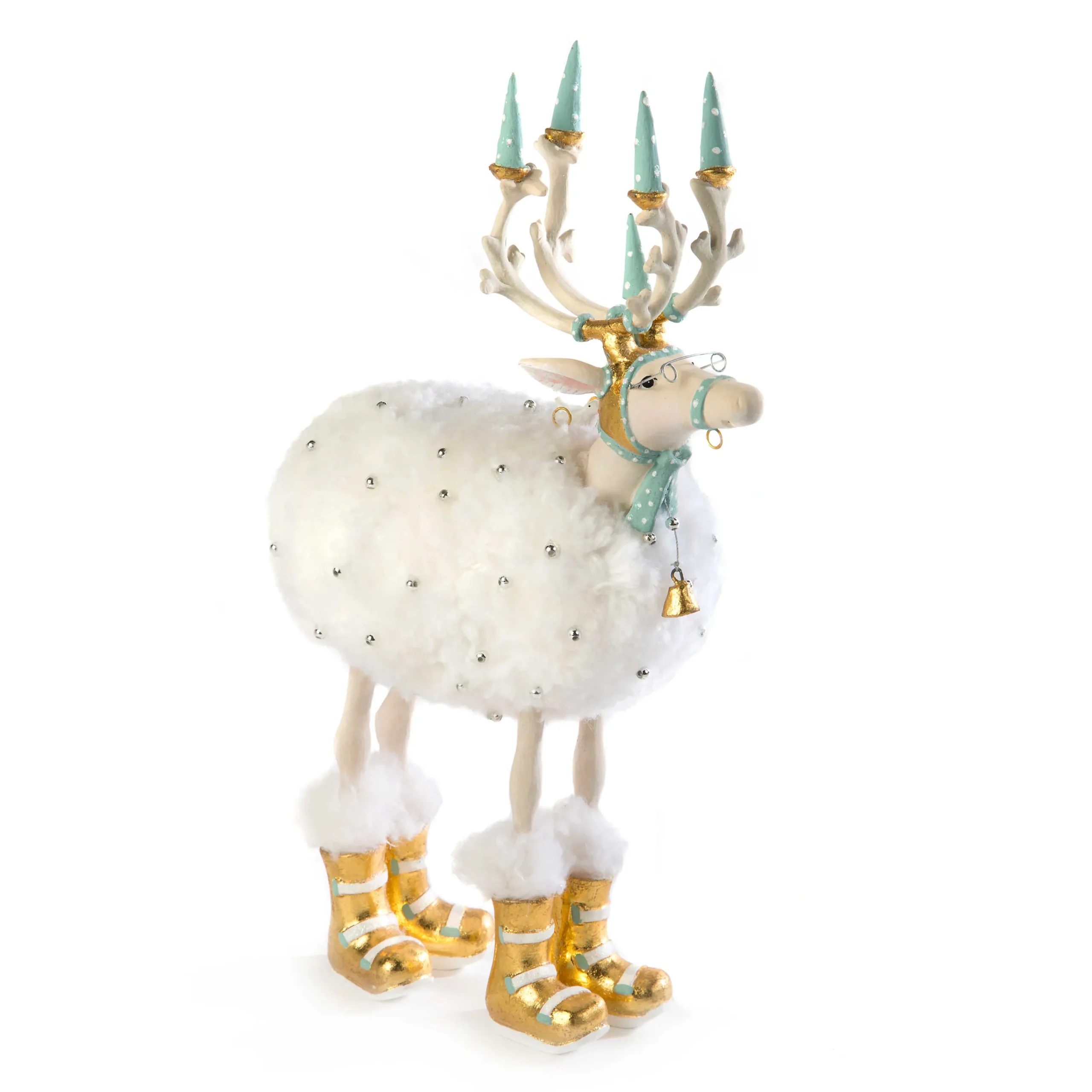 The Patience Brewster Moonbeam Blitzen Reindeer Figure is bundled up in a white wooly coat dotted with silver beads. His gold boots have touches of vintage green as do the trees on his antlers. Blitzen brings wisdom and experience to his Moonbeam team, and Santa and the seven other reindeer in the Moonbeam collection are happy to have him along.
