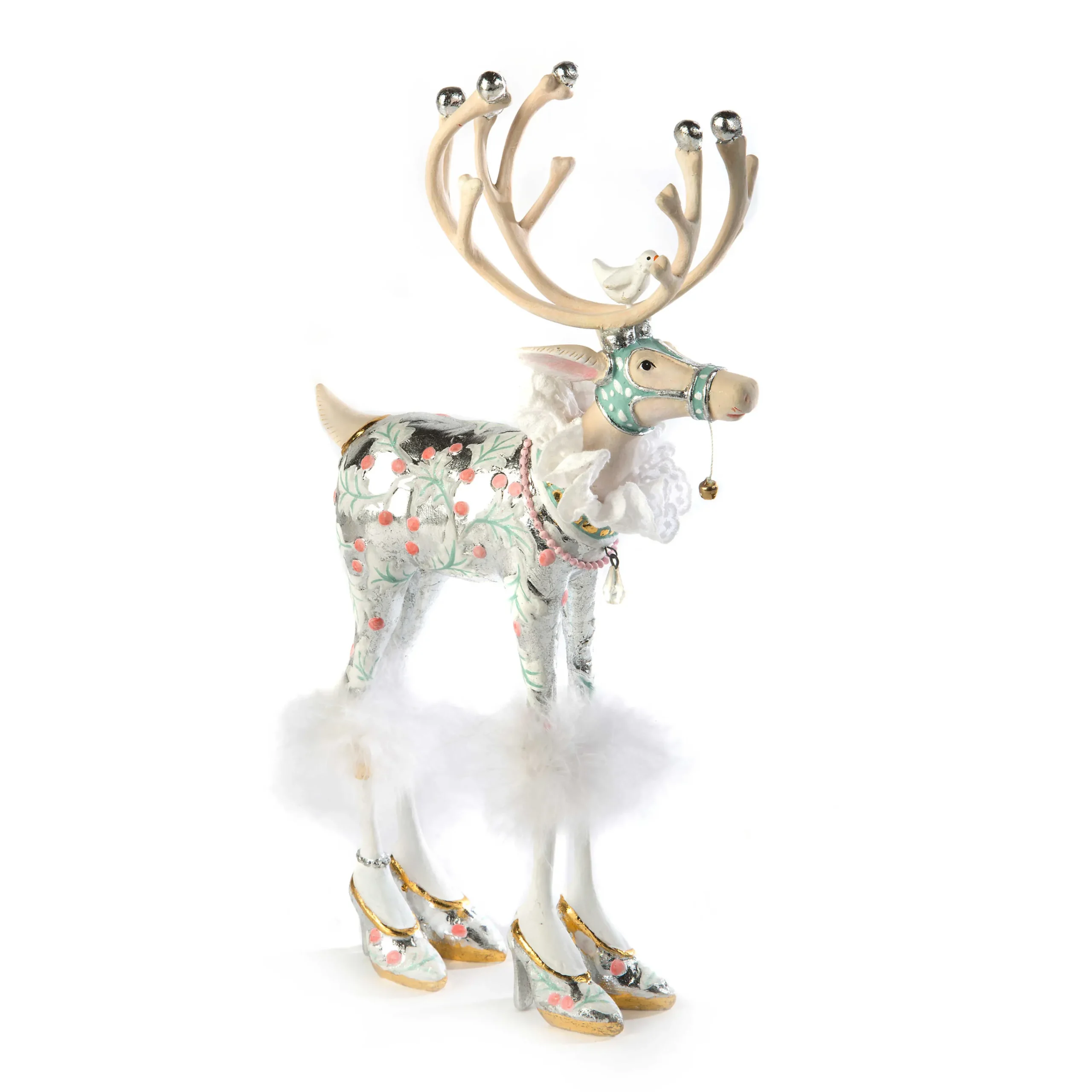 The Patience Brewster Moonbeam Vixen Reindeer Figure loves the spotlight and the moonlight! She’s dolled up in a white holly leaf jumpsuit with touches of silver, gold, and vintage green. She has feather-topped stockings and matching high heels, silver gloves, and white doves in her antlers. She aims to outdo and overdo! She runs with Santa and the rest of the reindeer team in the Moonbeam collection.