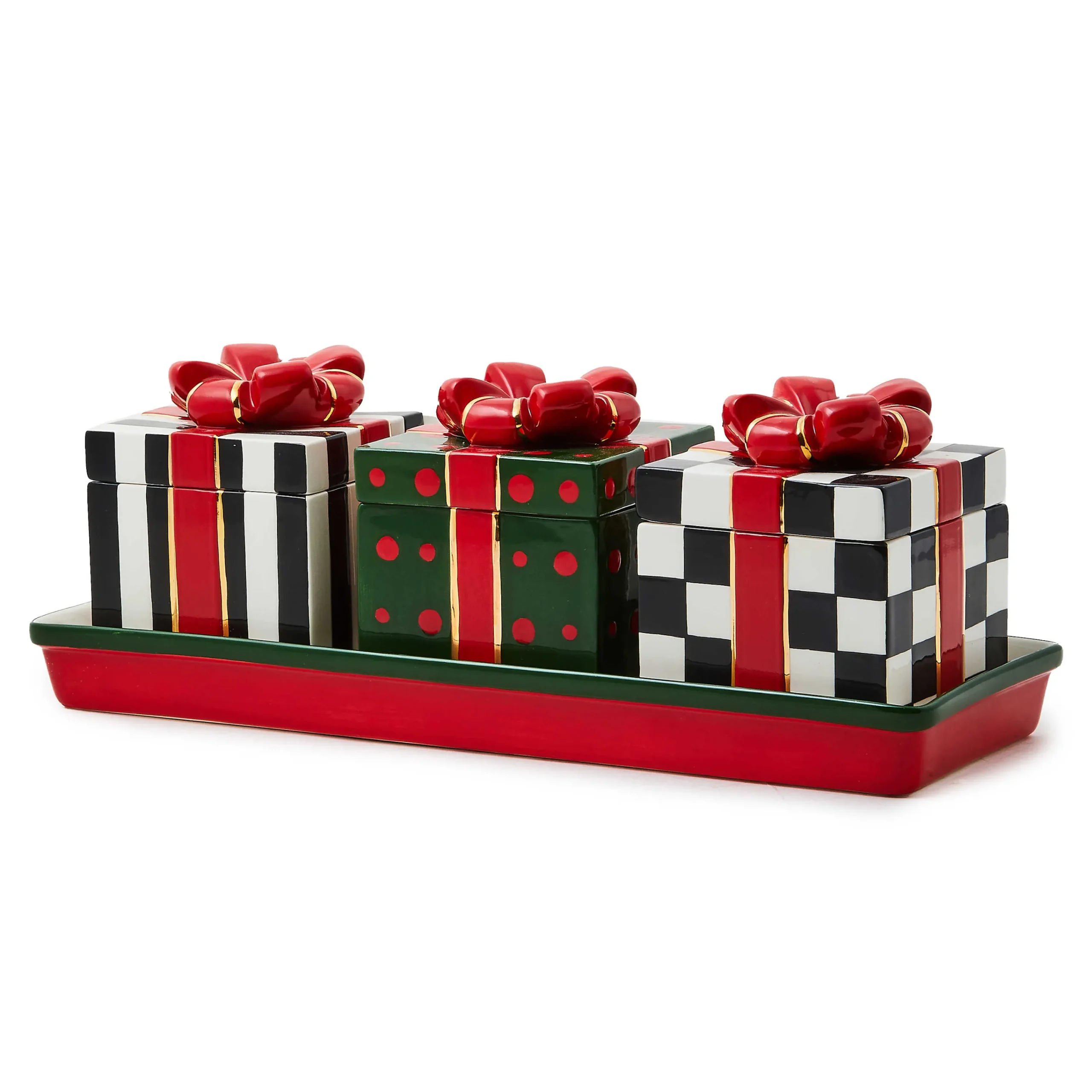 Deck the tabletops with this four-piece ceramic set of gift boxes and tray. The three gift boxes, decorated with stripe and dot patterns, have removable lids accented with bows and gold lustre. Fill this versatile set with holiday treats, special gifts, or dips to accompany a charcuterie.