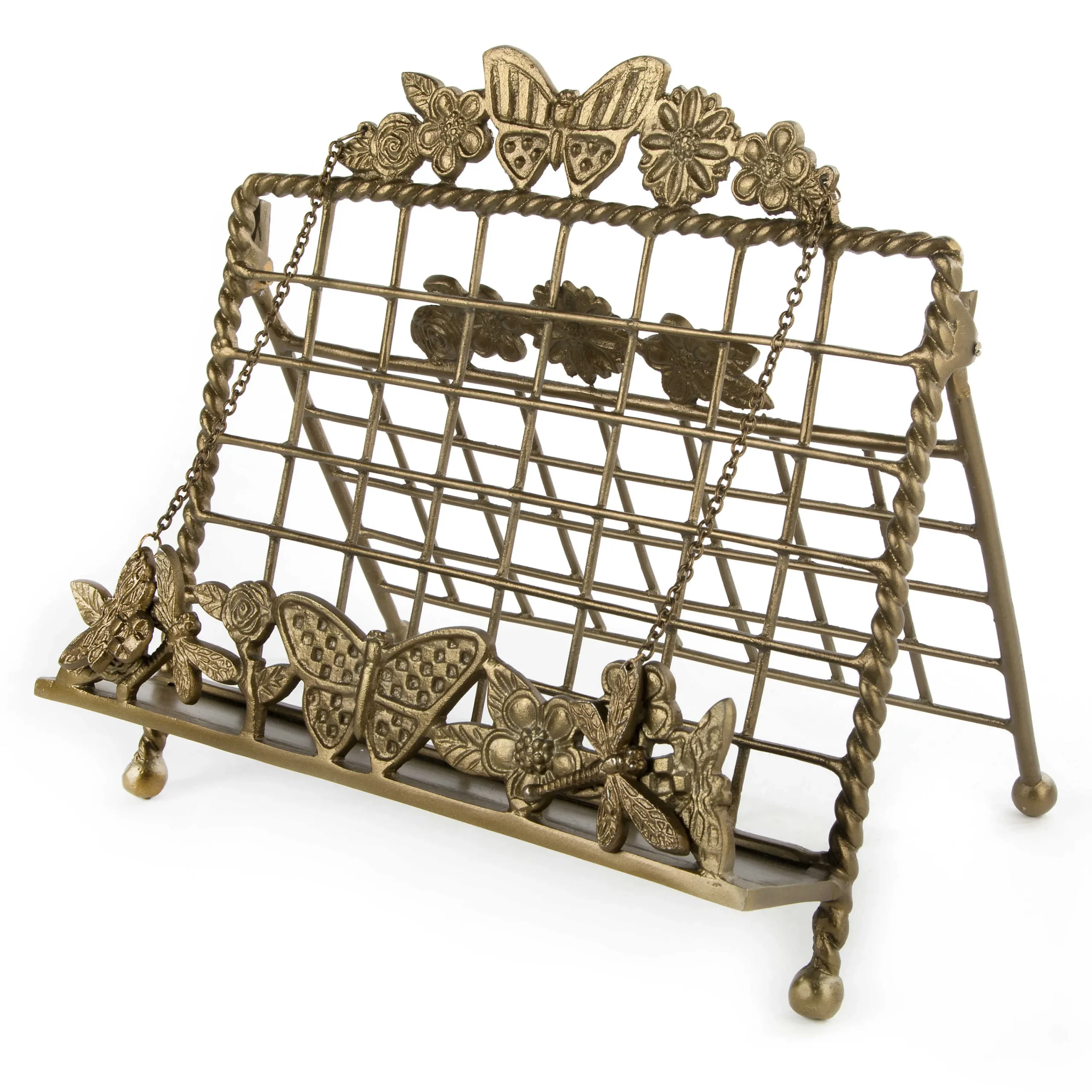 Designed to support and display your favorite and heaviest cookbooks, our cast aluminum Butterfly Cookbook Stand can safely support your tablet as well. Its height is ideal to hover over your mixing bowls while you create your next masterpiece. Two dragonflies are suspended from brass chains to keep pages in place, and it even folds flat for easy storage.