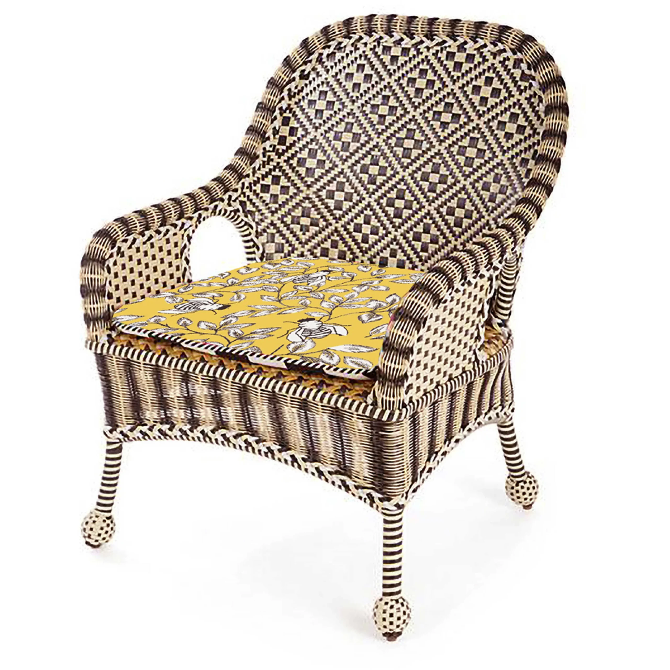 Take wicker up a notch with our Queen Bee Hut Courtyard Outdoor Accent Chair. It’s fashioned in a timeless geometric pattern of hand-woven black, white, and goldenrod resin wicker. It’s set with a Sunbrella cushion that reverses from bumblebee print to black and white stripes, trimmed with twisted black and white cording.