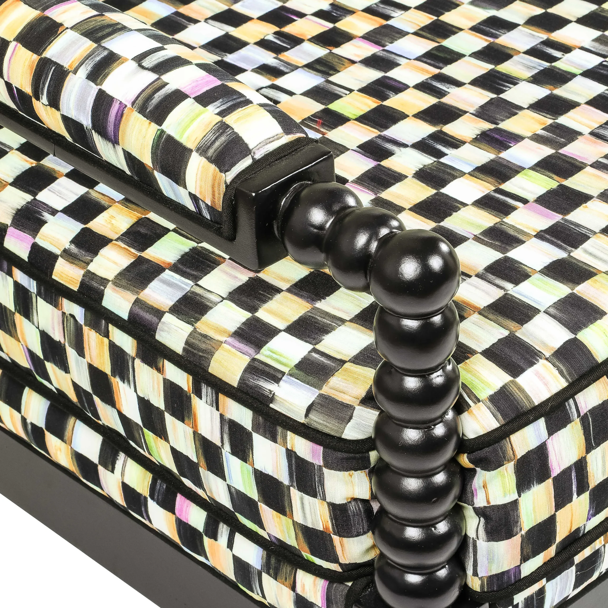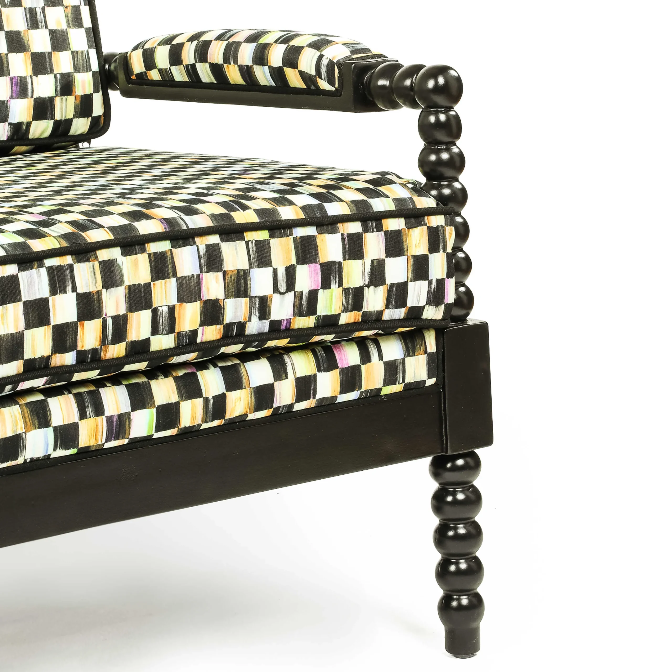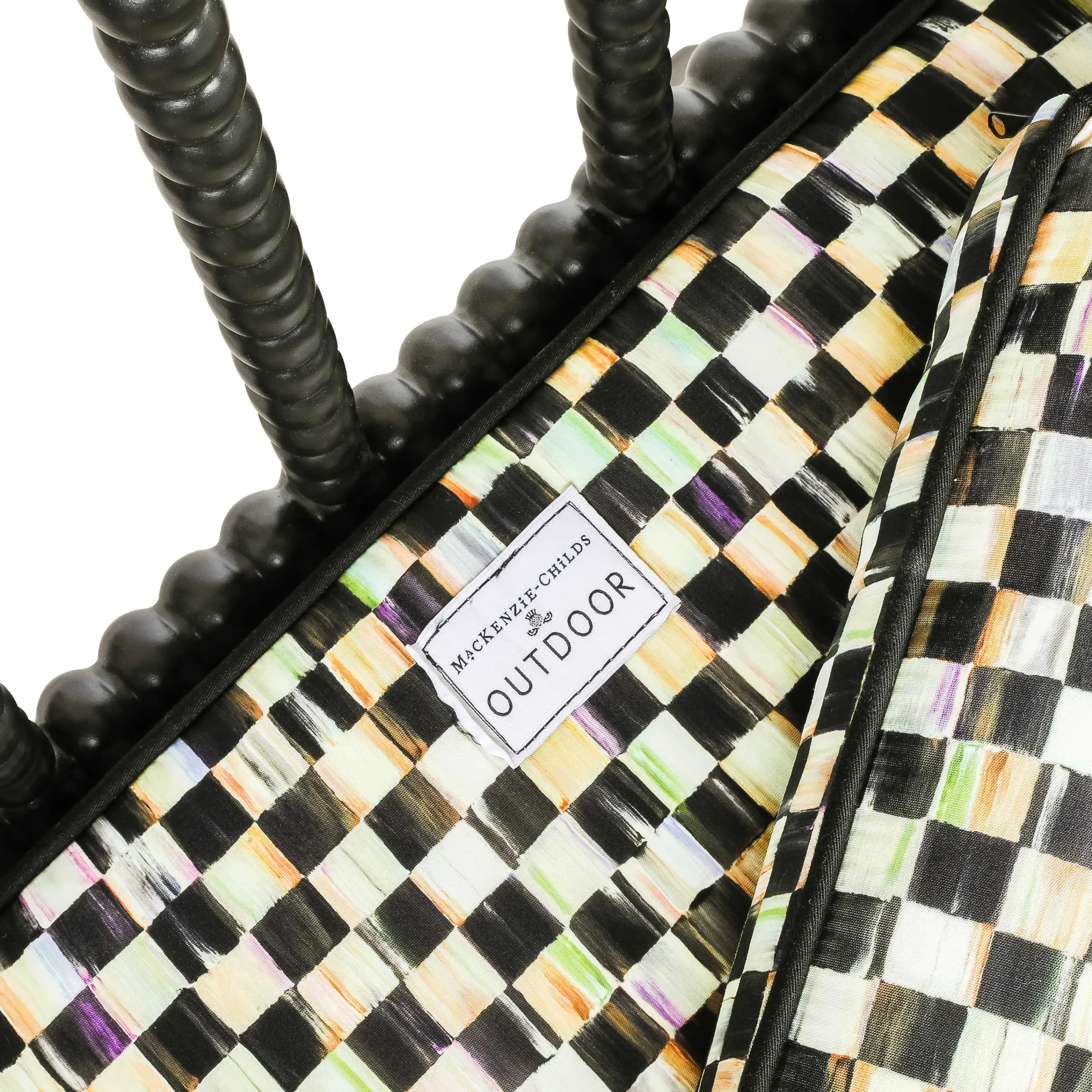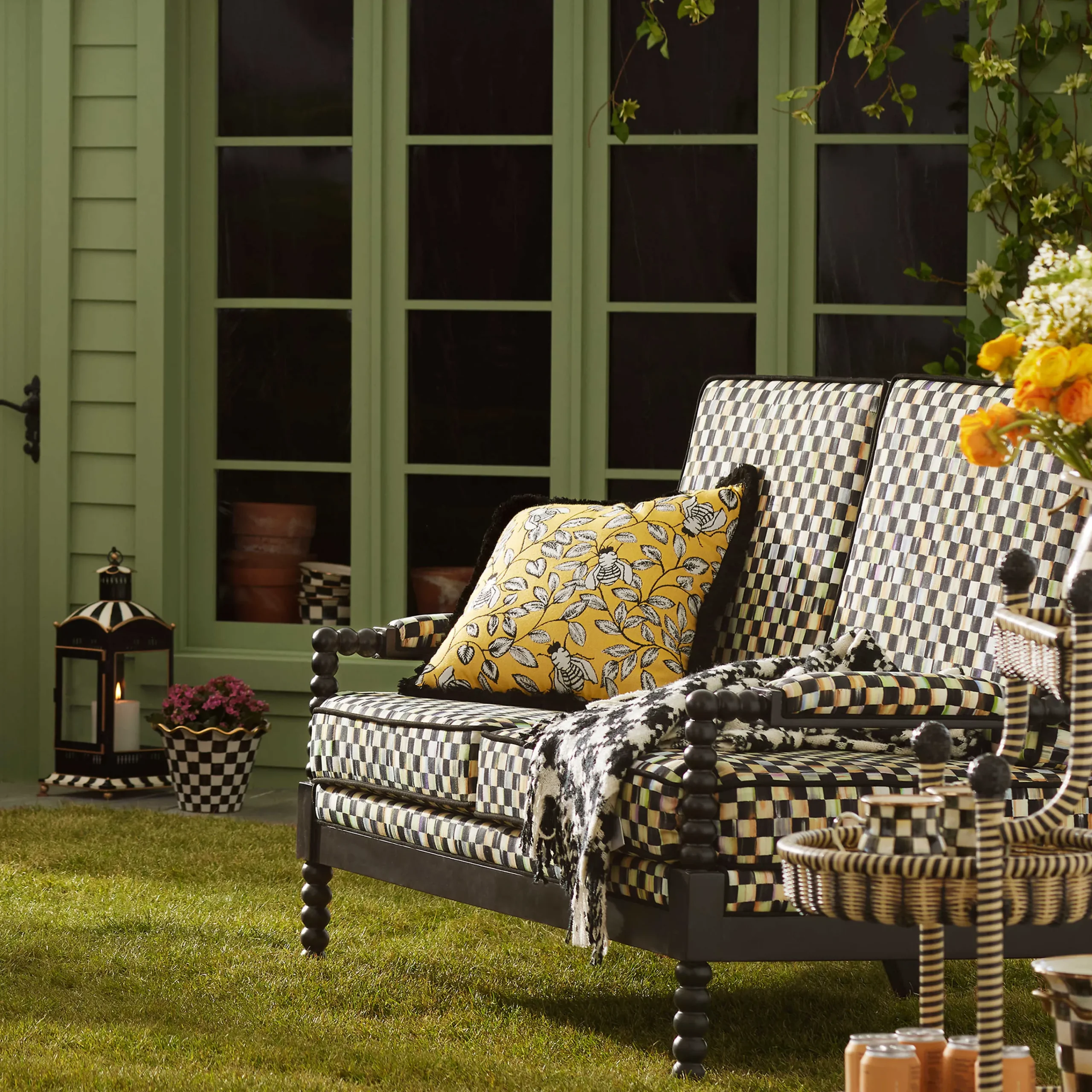 The Spindle Check Outdoor Loveseat is a modern take on parlor style, now for the patio, in weather-ready materials and our most iconic MacKenzie-Childs pattern. We start with chic black spindle frames and dress them up with outdoor cushions in eye-catching Courtly Check. Equally elegant on the lakeside deck of a beloved family camp as in an urban townhouse sunroom, this suite brings the indoors out with panache.