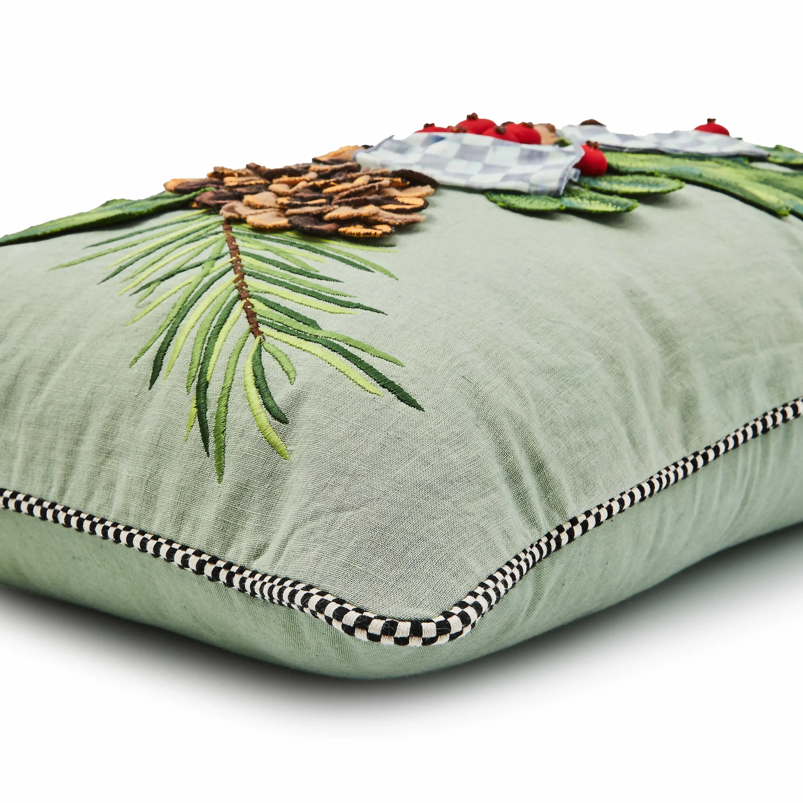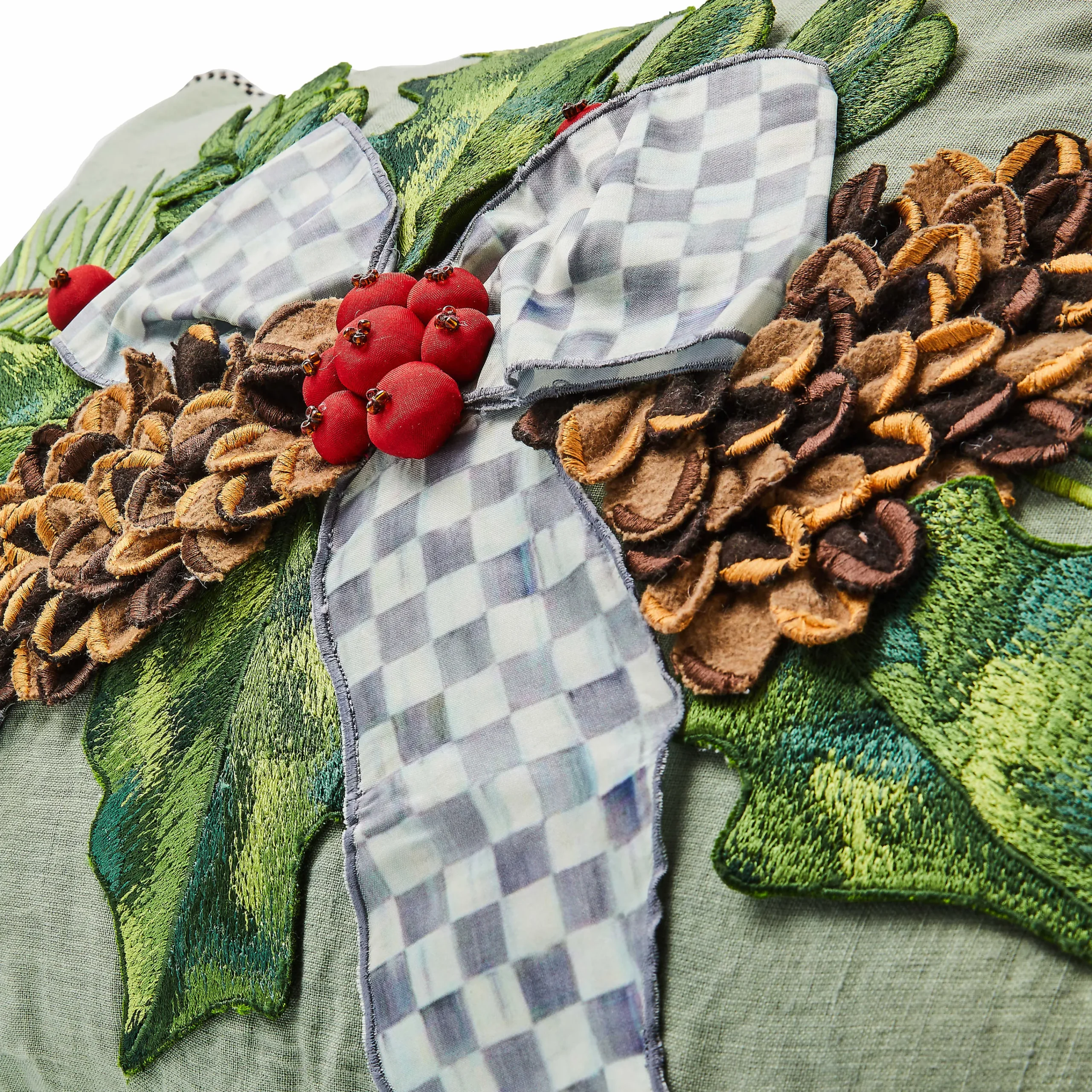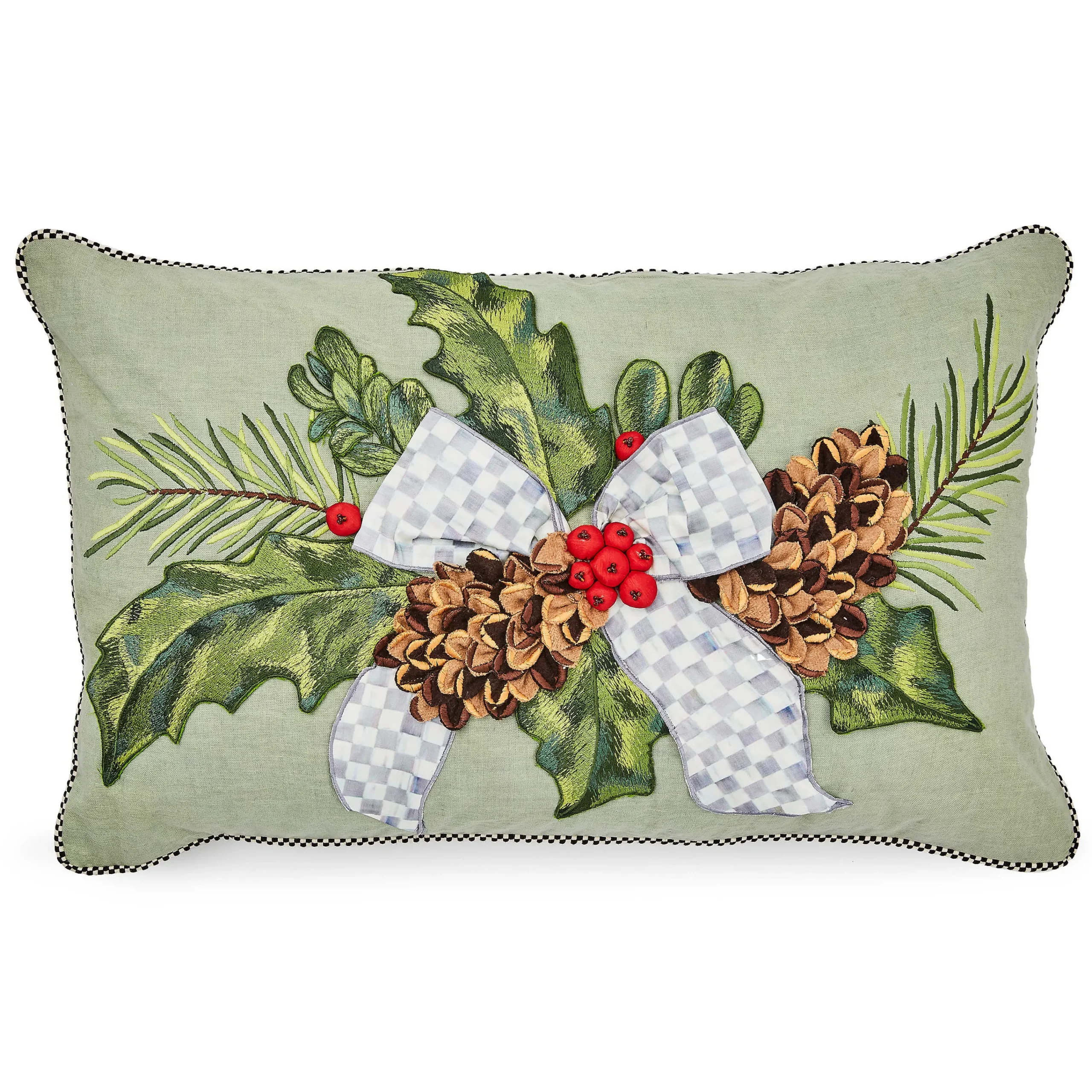 Add comfort and joy to your holiday home with this lumbar pillow, featuring appliqued and embroidered holly leaves, accented with dimensional pinecones and holly berries, and trimmed with a Sterling Check® ribbon bow.