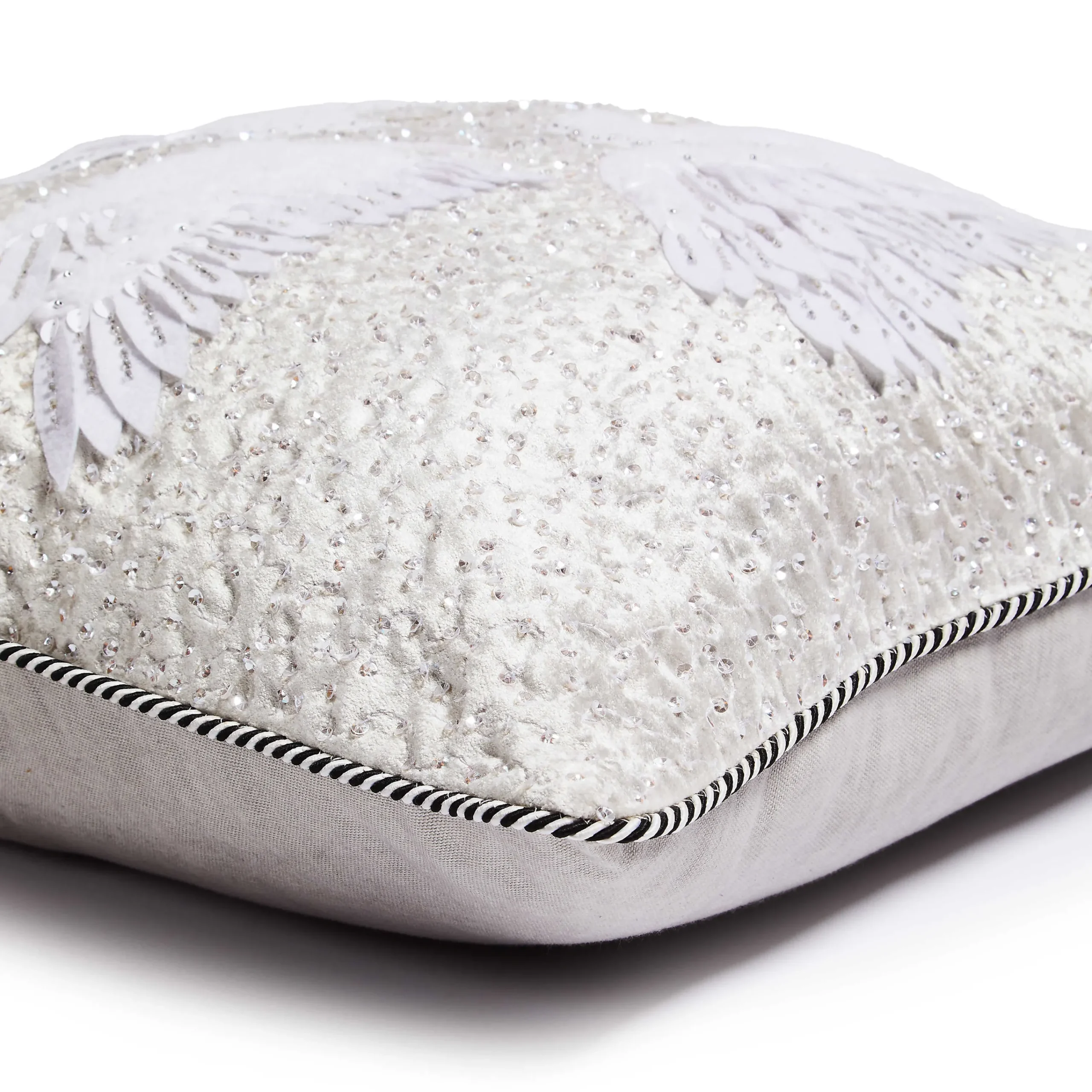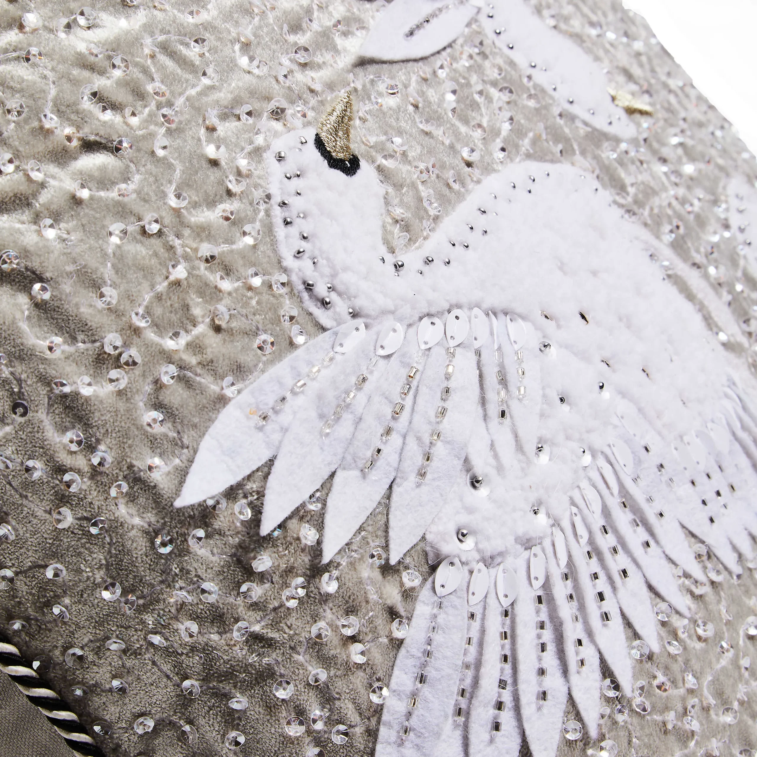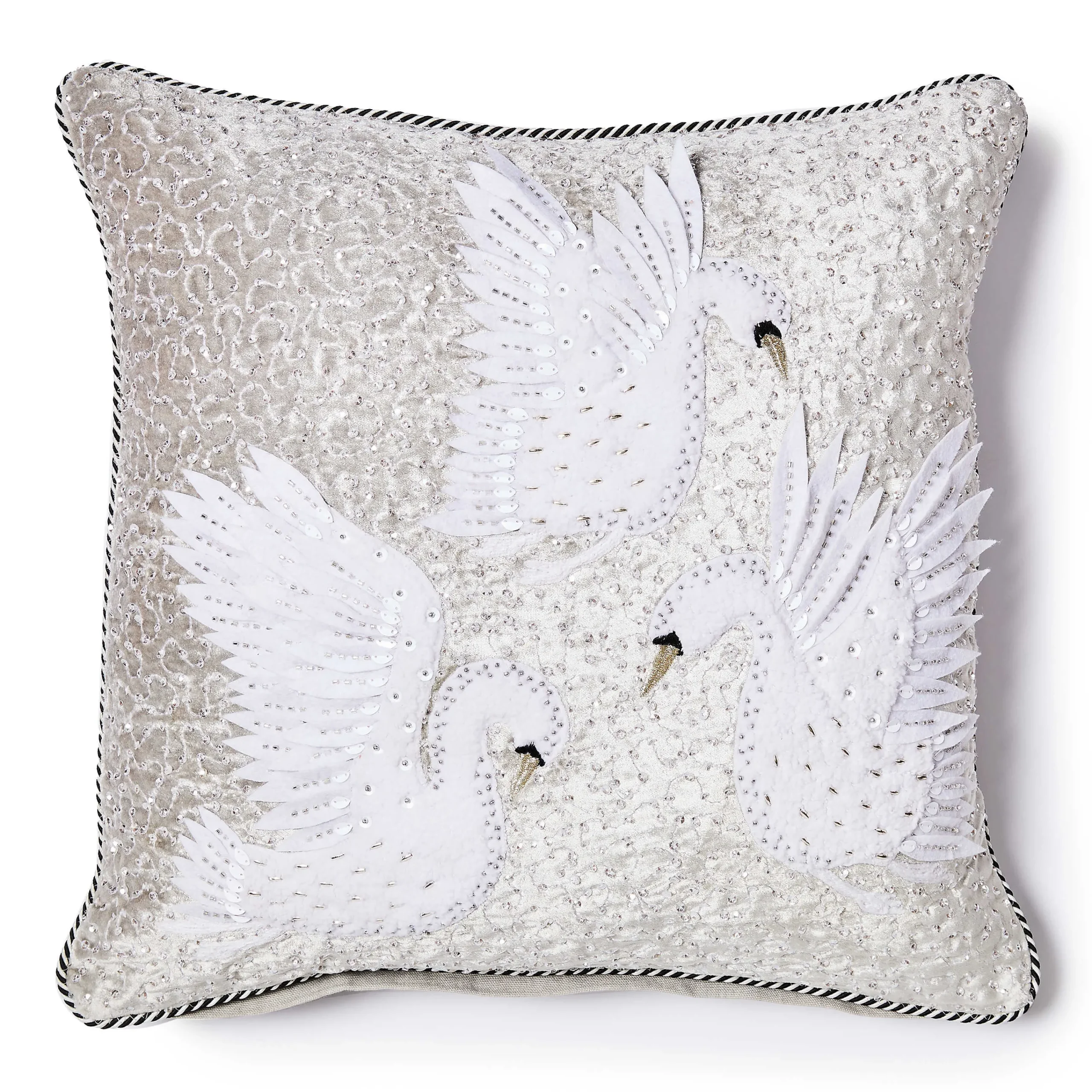 Add comfort and joy to your holiday home with this silver-colored velvet throw pillow that’s embellished with an embroidered and beaded design and accented with a trio of bejeweled swans.