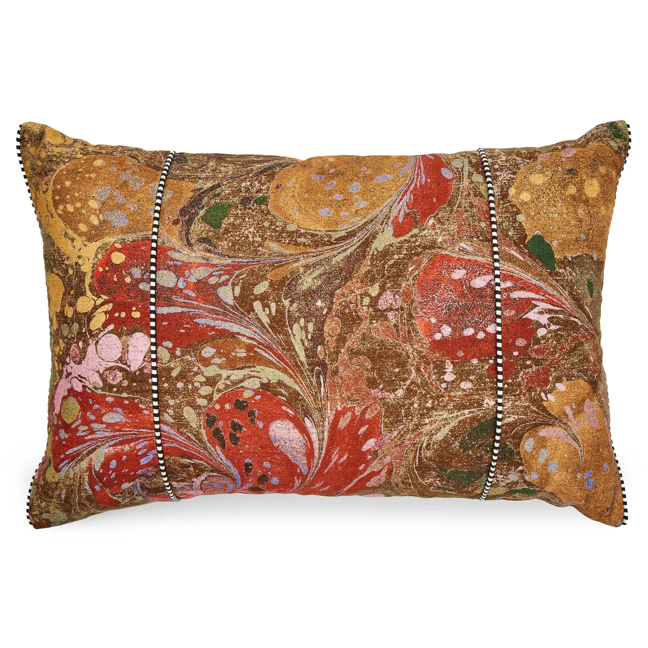 Add a pop of color with this lumbar pillow, featuring a printed marbleized pattern that’s trimmed with black and white piping.