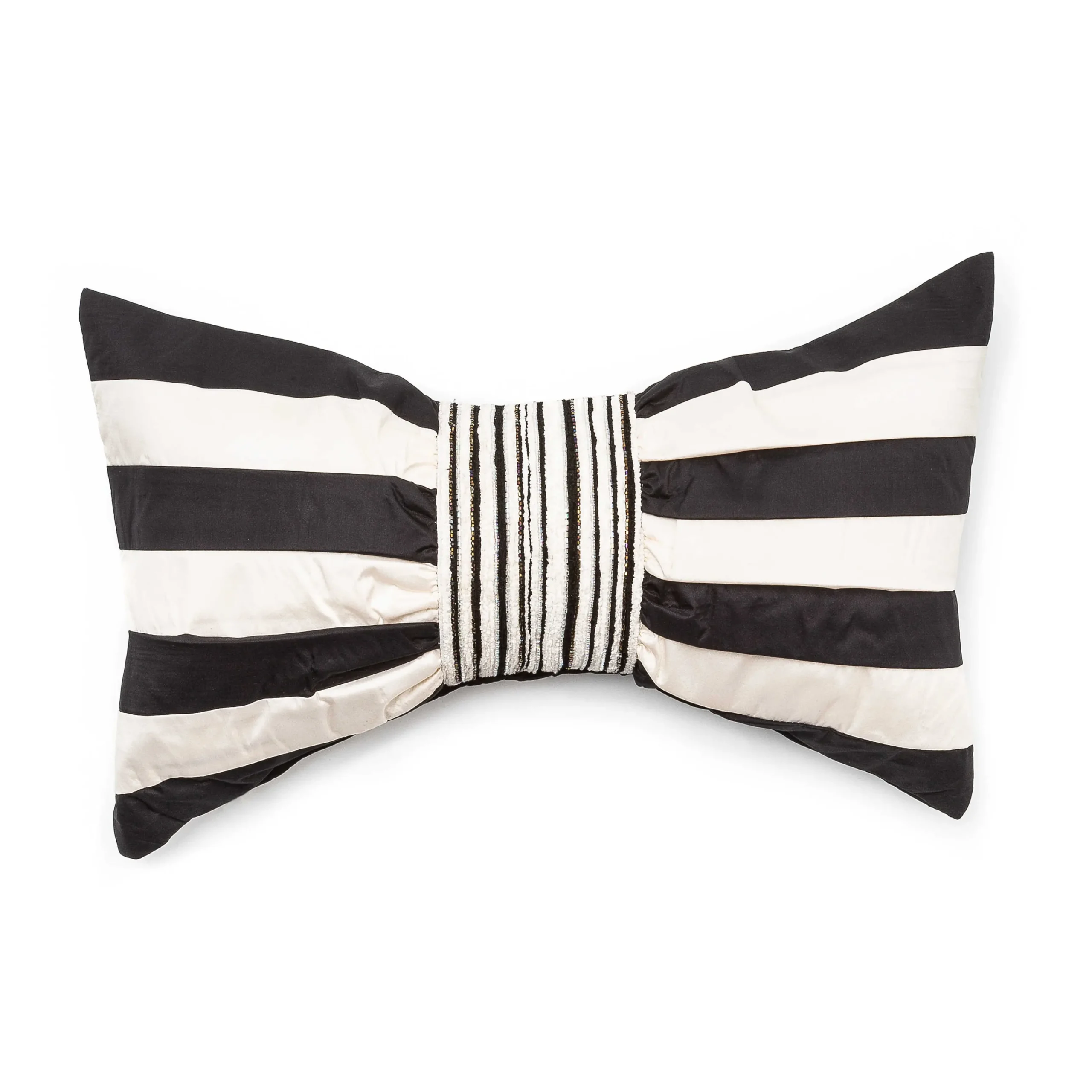 The Marquee Bow Pillow is all black, white, and wow! Striped black and white polished cotton gets a cinch in the center from an embroidered and beaded band. Bonus points for this one because its simple stylishness goes with so many of our collections!