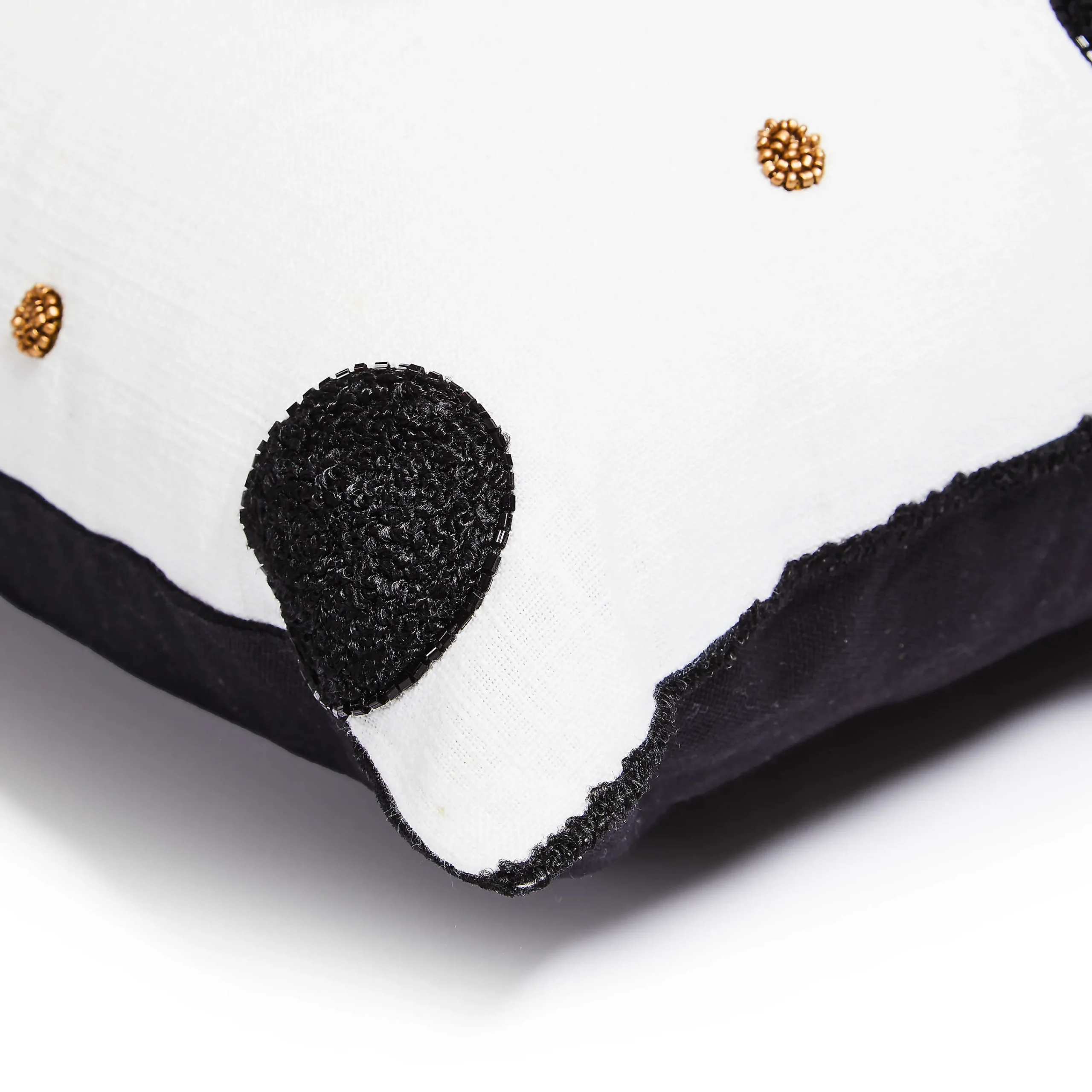 Put your stamp on style with this monogram throw pillow. The black and white letter is digitally printed and then embellished with beading and chenille embroidery. It’s trimmed with black piping.