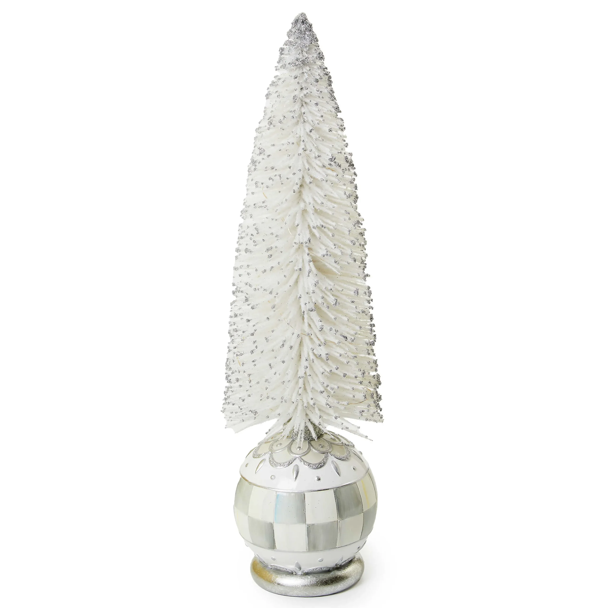Deck the table, the mantel, and more with this medium illuminated white bottle brush that’s dusted with silver glitter and set in an ornament base decorated with Sterling patterns and glitter.