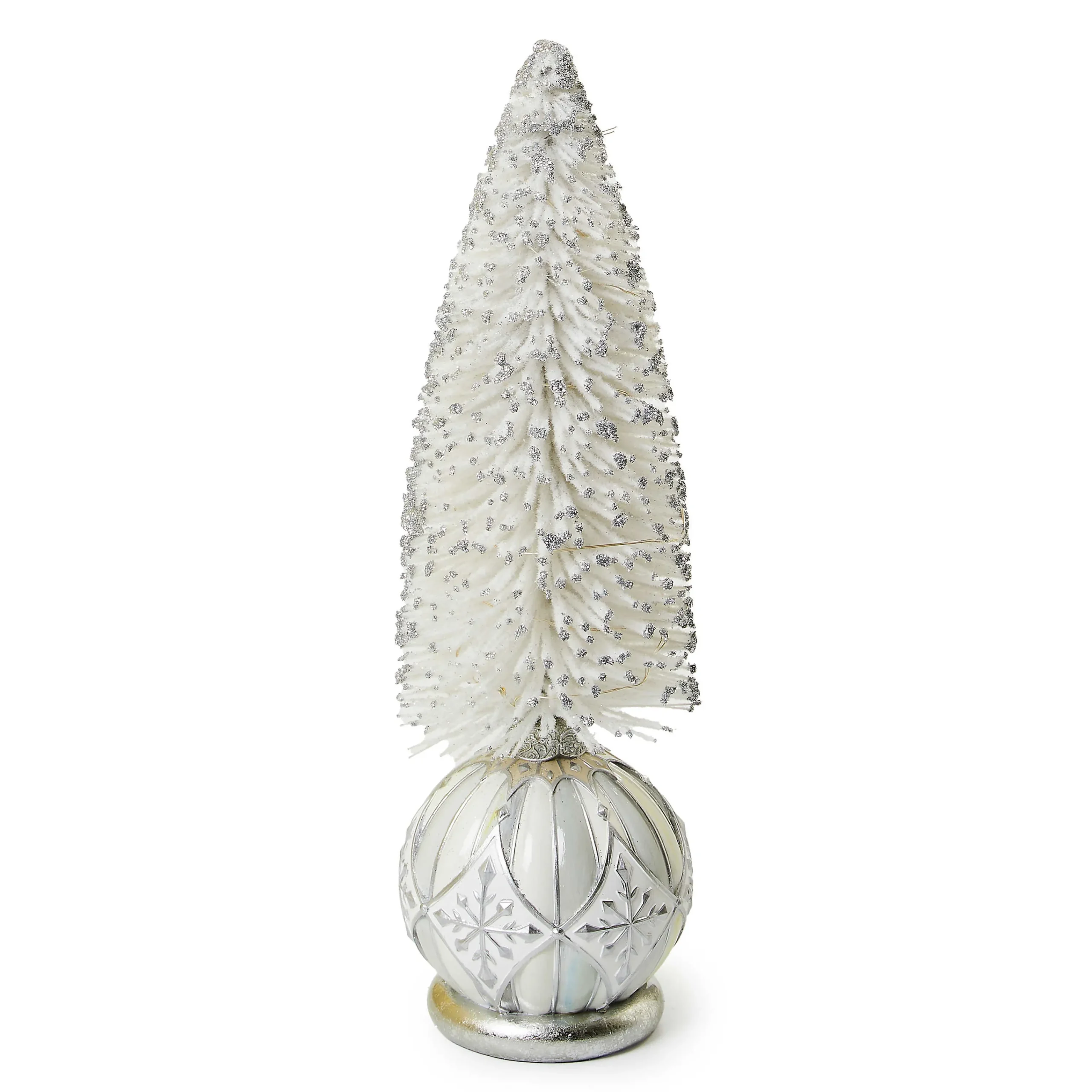 Deck the table, the mantel, and more with this small illuminated white bottle brush that’s dusted with silver glitter and set in an ornament base decorated with Sterling patterns and glitter.
