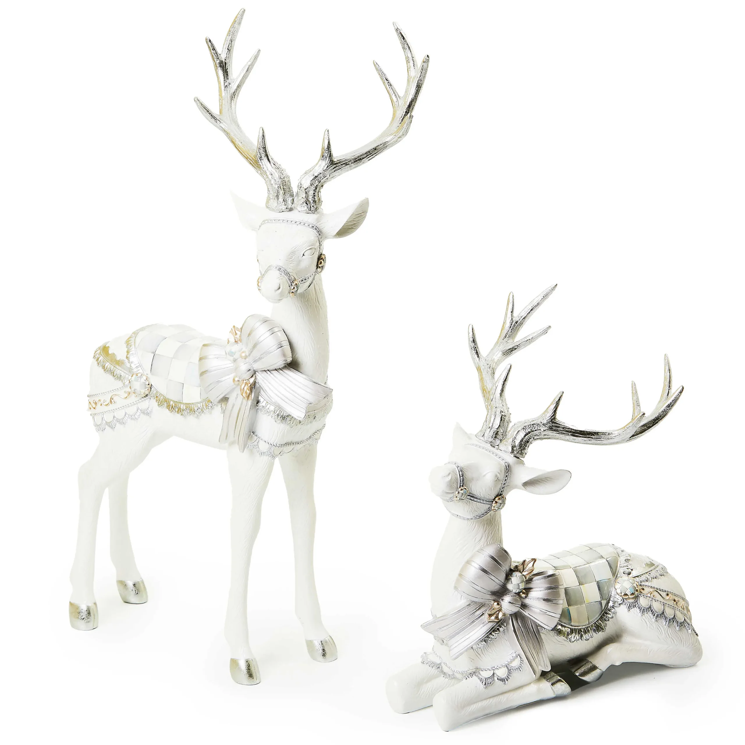 Deck the tabletops or the mantel with this wintry white standing deer that’s decorated with silver leaf hooves and antlers. It’s wearing a Sterling Check® saddle that’s embellished with silver ribbon and trims.