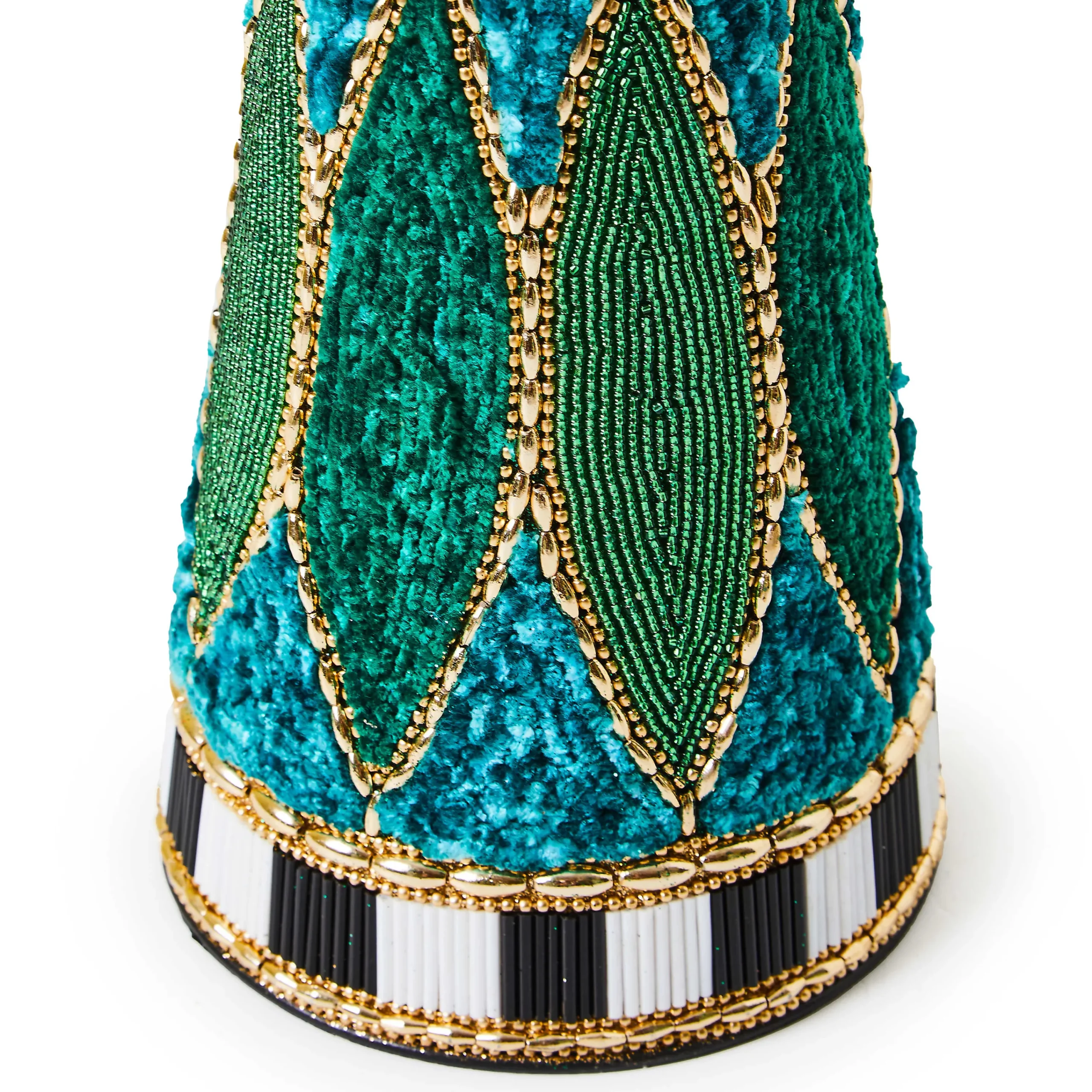 Deck the tabletops with this small cone-shaped tree that’s embellished with velvet ribbon and patterns done in emerald green and blue chenille and beads. It’s finished with bands of faceted black and white accents.