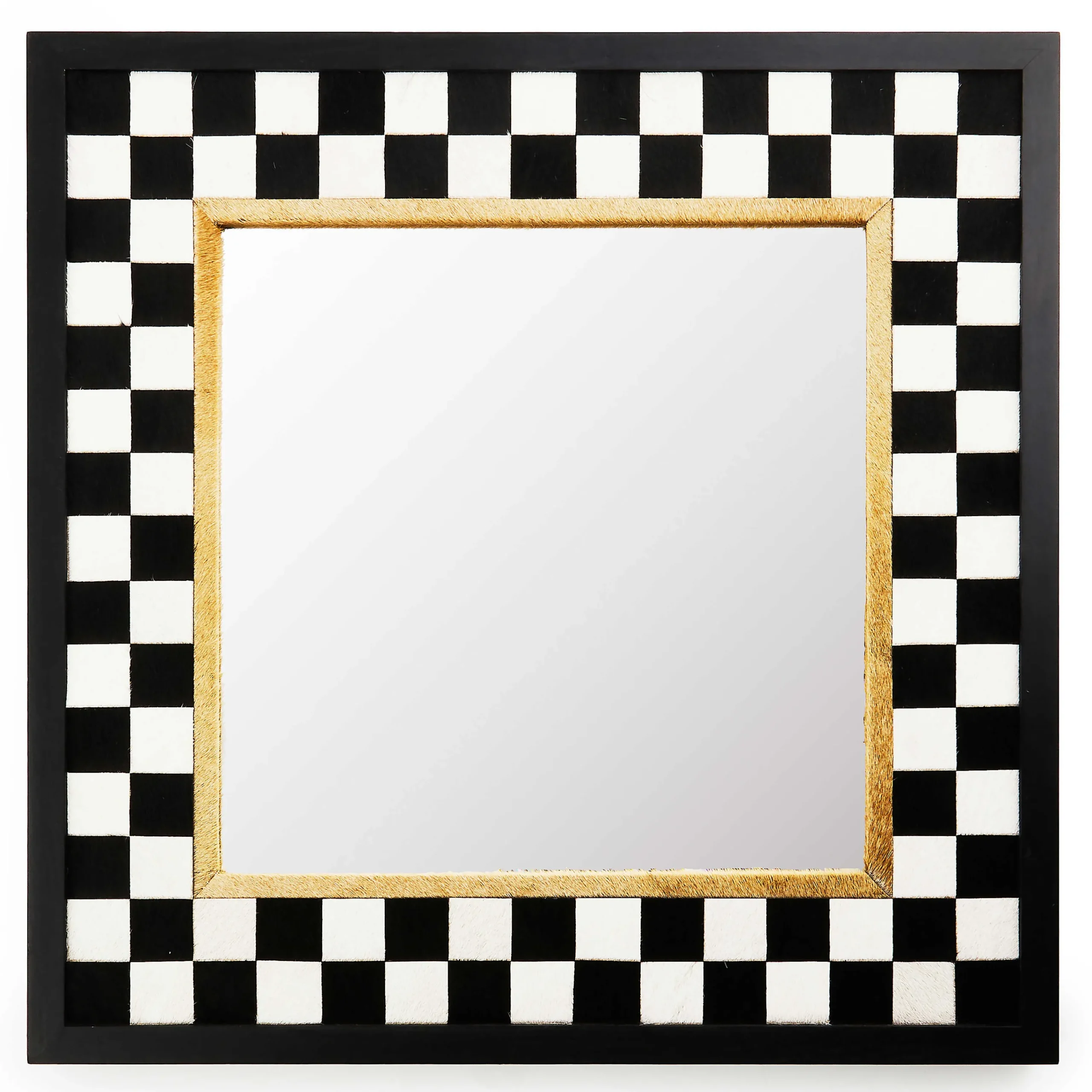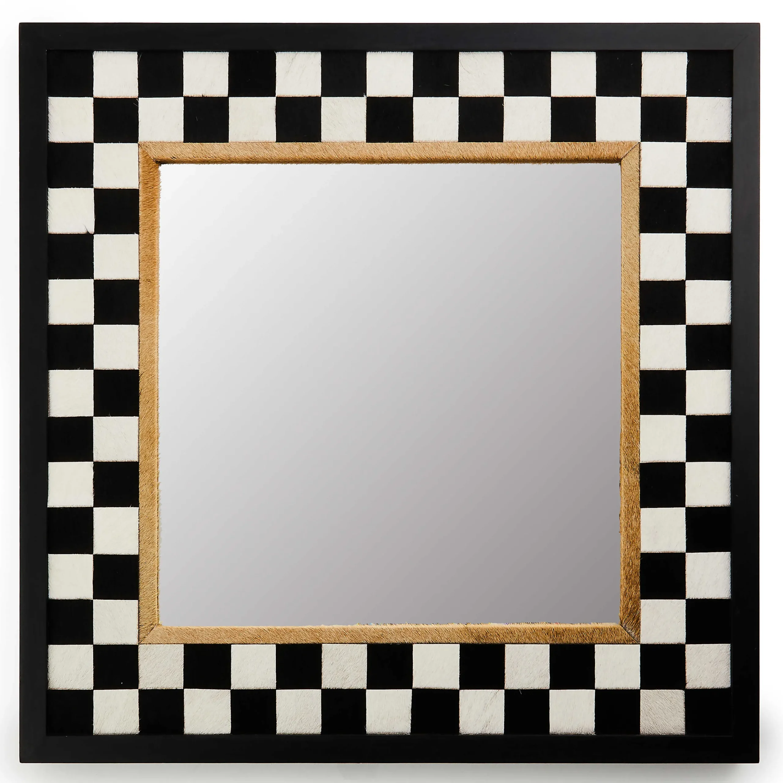 As you head out the door, why not “check” yourself out with this square beveled mirror, featuring cow hair-on-hide checks with stained oak veneer around the mirror window. Multiples of this mirror can form a variety of interesting arrangements.
