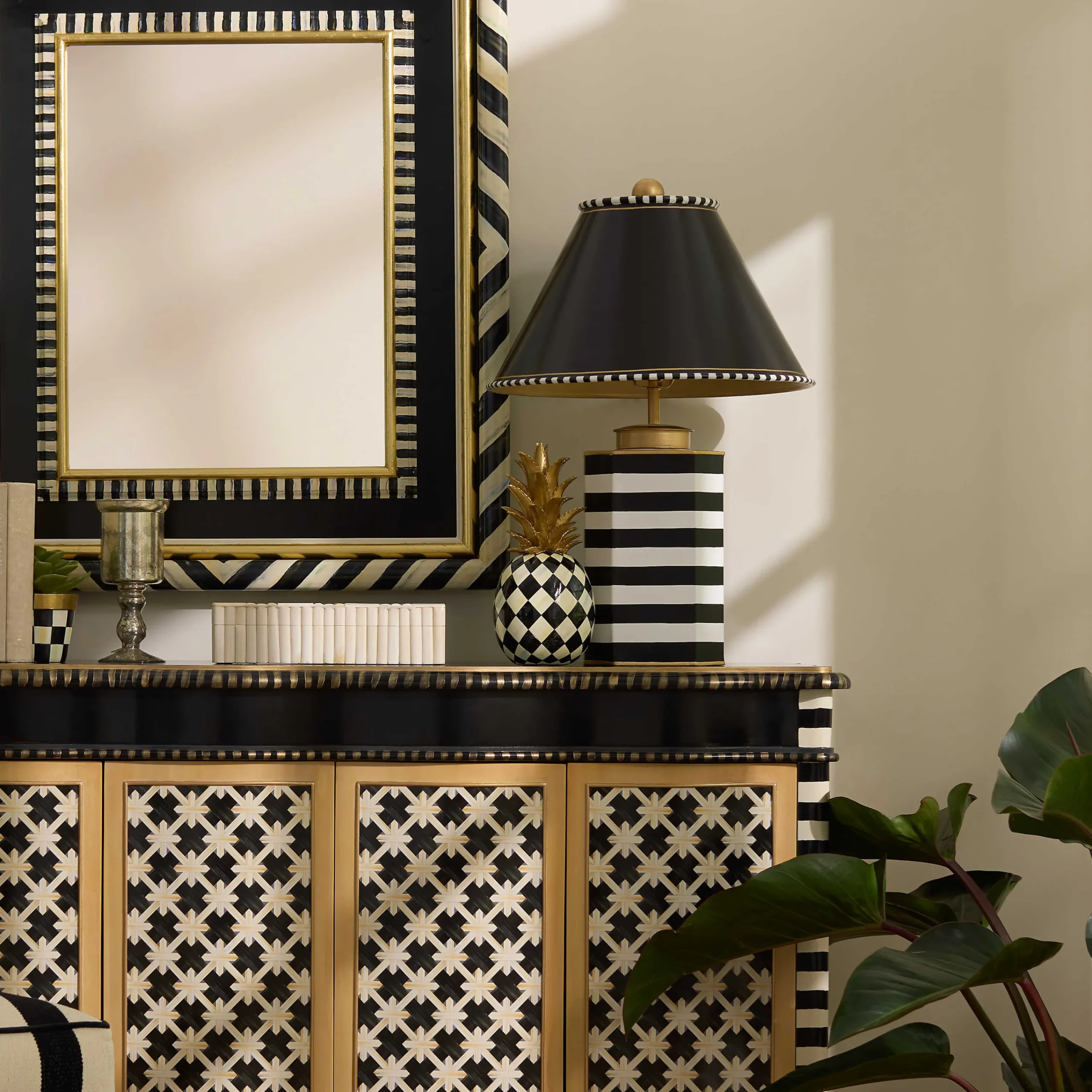 Is there a better housewarming gift than our Marquee Pineapple Sculpture, which highlights the symbol of hospitality? It’s made of resin, hand-painted with our Courtly Harlequin pattern, and topped with a crown of gold foil.