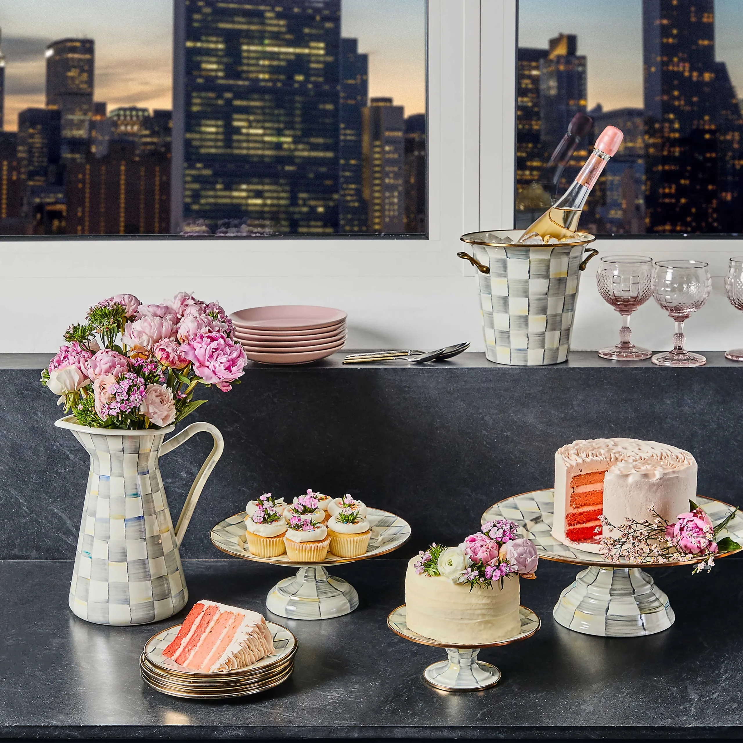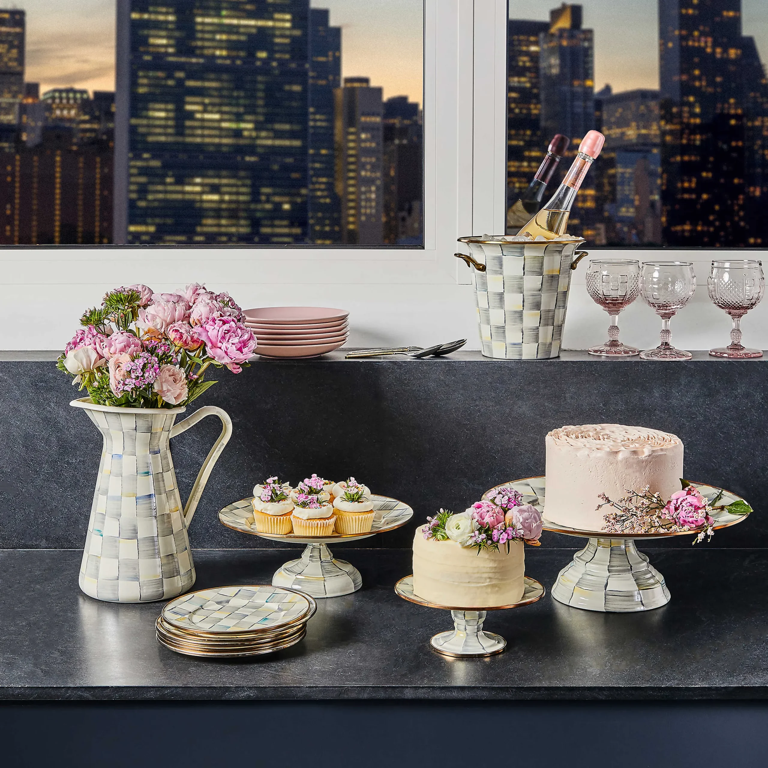 Make every day extraordinary with our colorful, fun, and richly patterned enamelware. The Mini Sterling Check Pedestal Platter features an enameled steel underbody rimmed in bronzed stainless steel. Stack it atop the small and large platters to make a real statement!