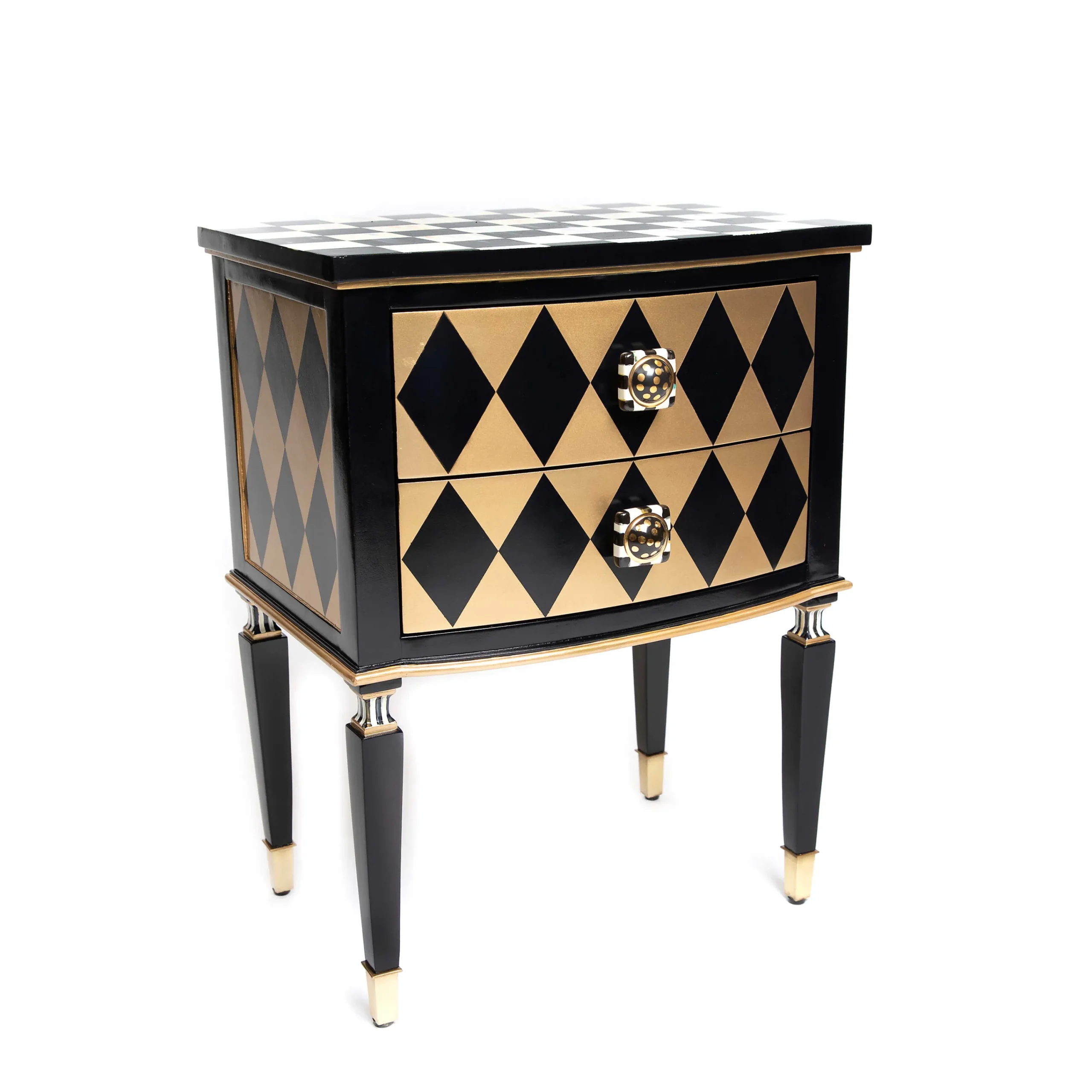 Our Masquerade Accent Chest makes a dramatic entrance into any room. Featuring two drawers accented with our ceramic Courtly Check® Petit Four Square knobs, it’s hand-painted by our Aurora, New York, artisans, who add Courtly Stripe to the legs, which are accented with brass ferrules.