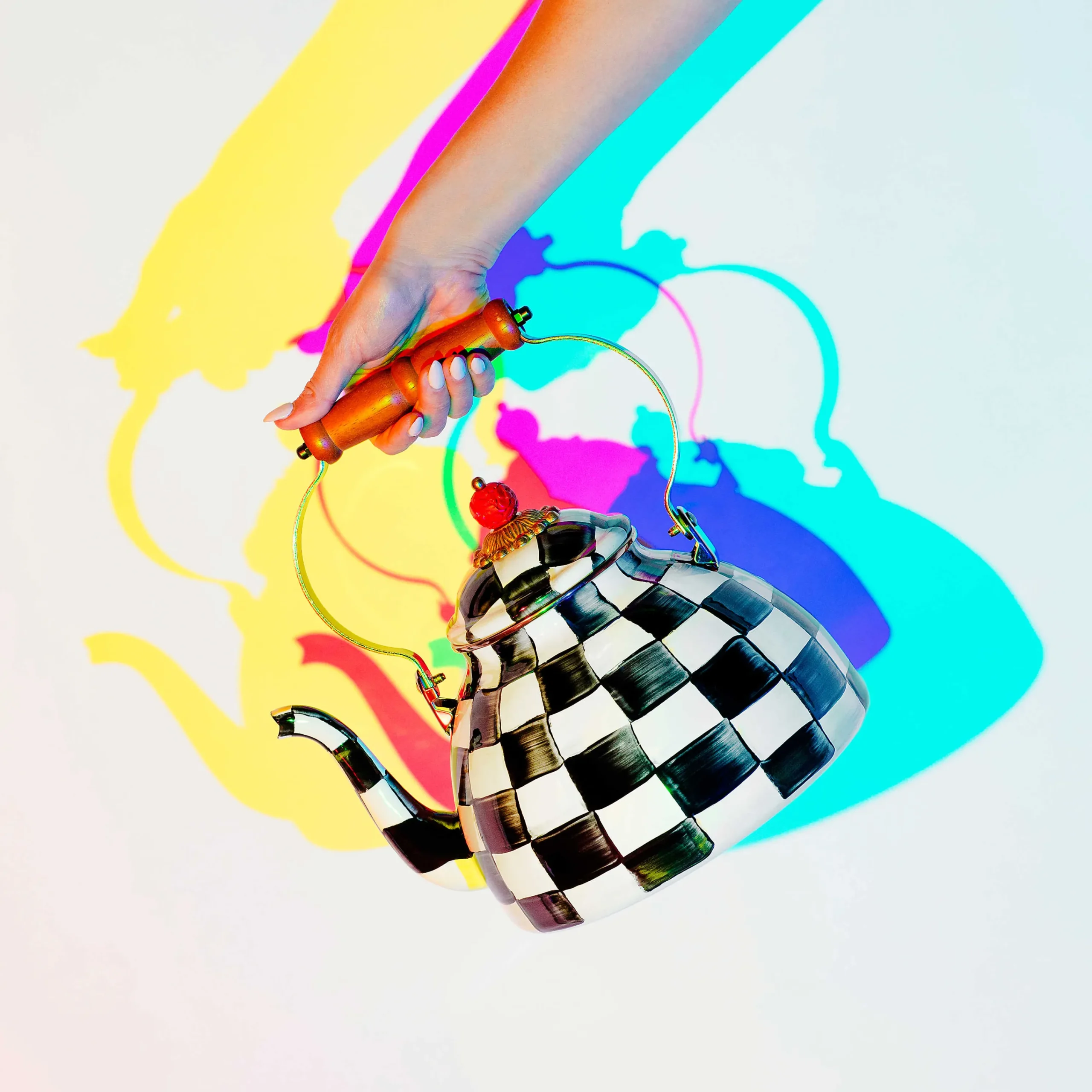Our famed black and white checked tea kettle. Bubbling over with MacKenzie-Childs style, our Courtly Check® Enamel 3-Quart Tea Kettle will have you finding new reasons to put the kettle on to boil. The heavy-gauge steel underbody is hand-painted with our color-dragged Courtly Checks® and ceramic glaze, and rimmed in bronzed stainless steel. With a wood handle, and a lid topped with brass accents and a carved faux-cinnabar bead, you may find yourself leaving this charming piece on the stovetop for kitchen beautification. Or place it on display, filled with fresh-cut flowers or greens. A perfect gift for seasoned collectors, or a welcome invitation for a friend new to our Courtly Check® wares.